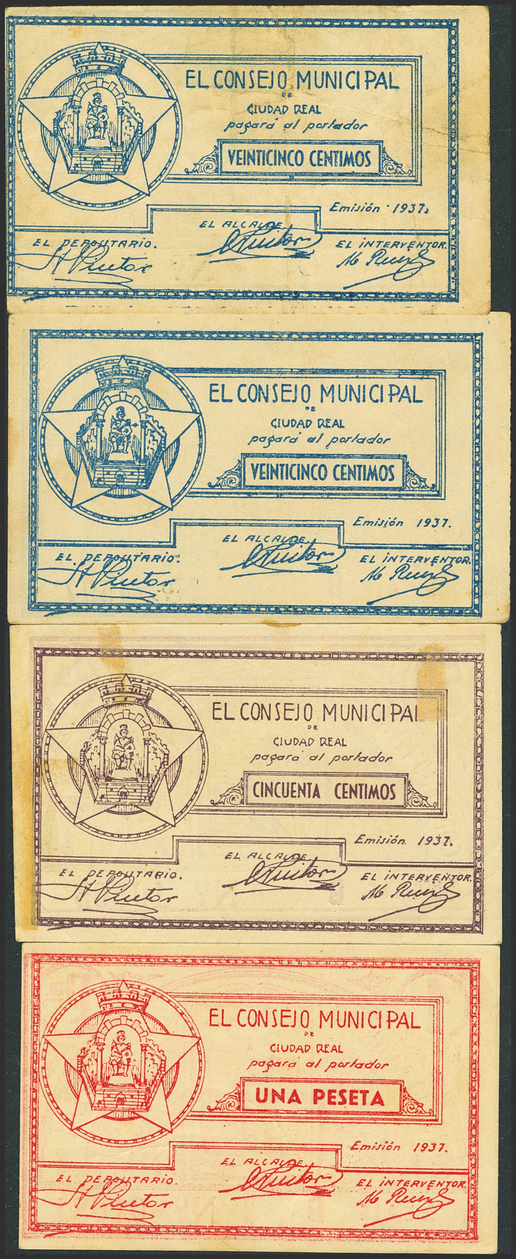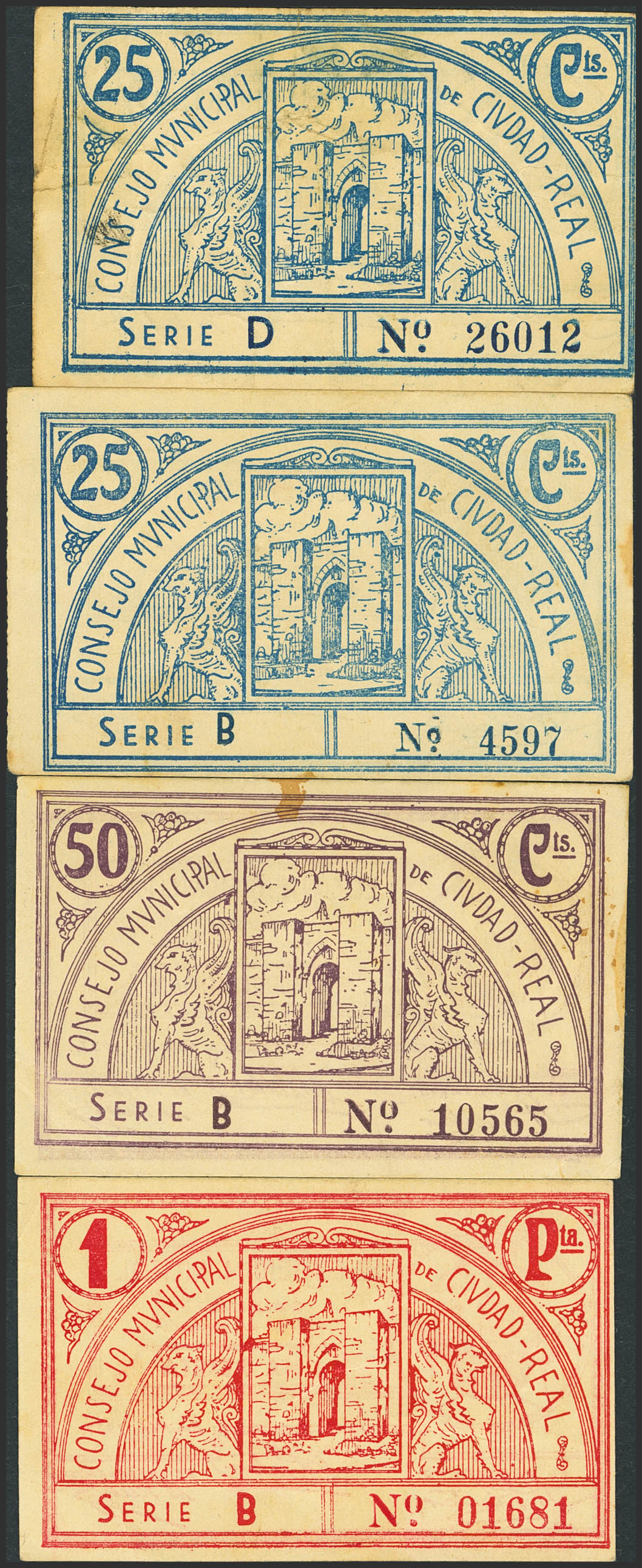 CIUDAD REAL. 25 Cents, 50 Cents and 1 Peseta. 1937. Series D, B, B and B, respectively. (González: 1980/82). Rare complete series (the 25 cts two notes with different series). VF+.