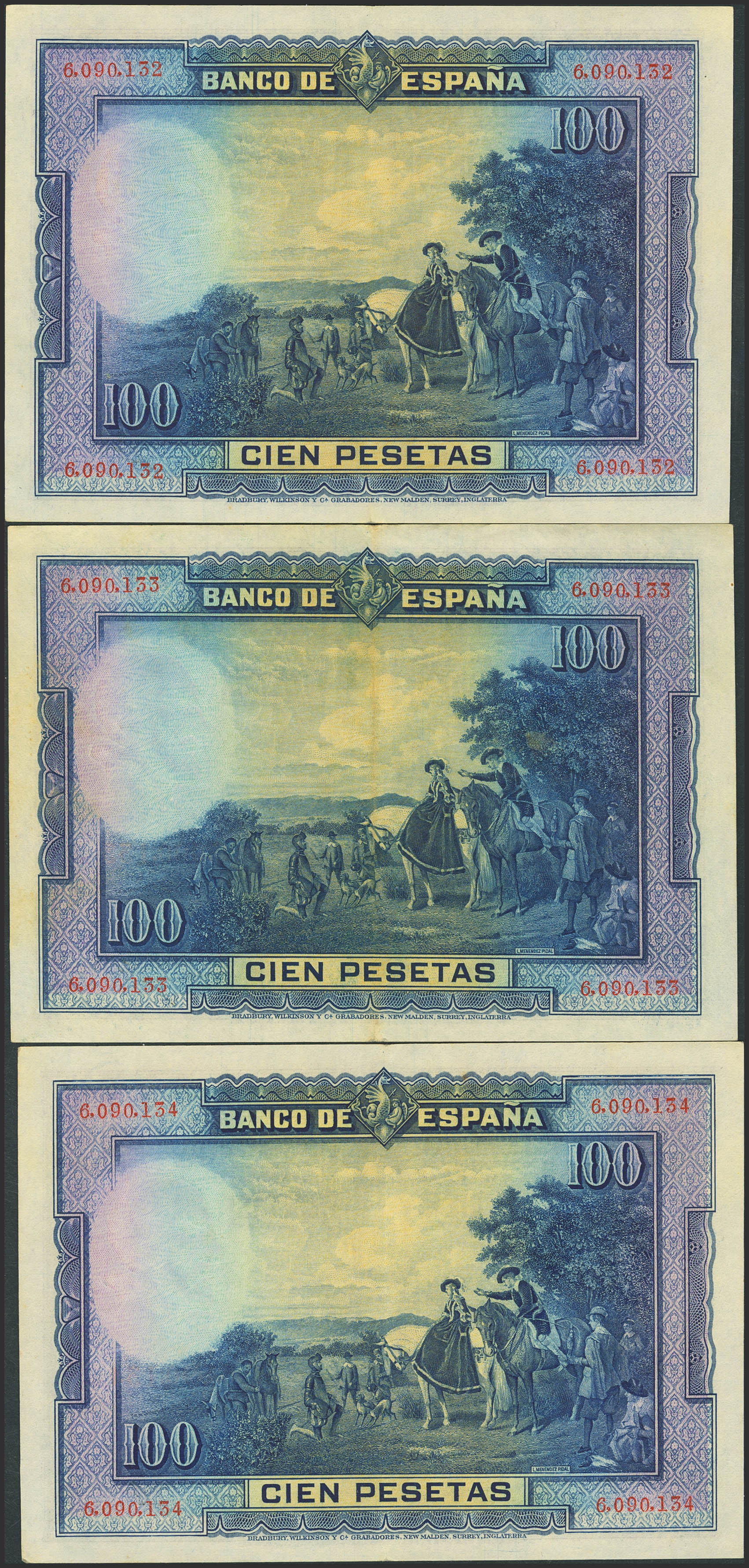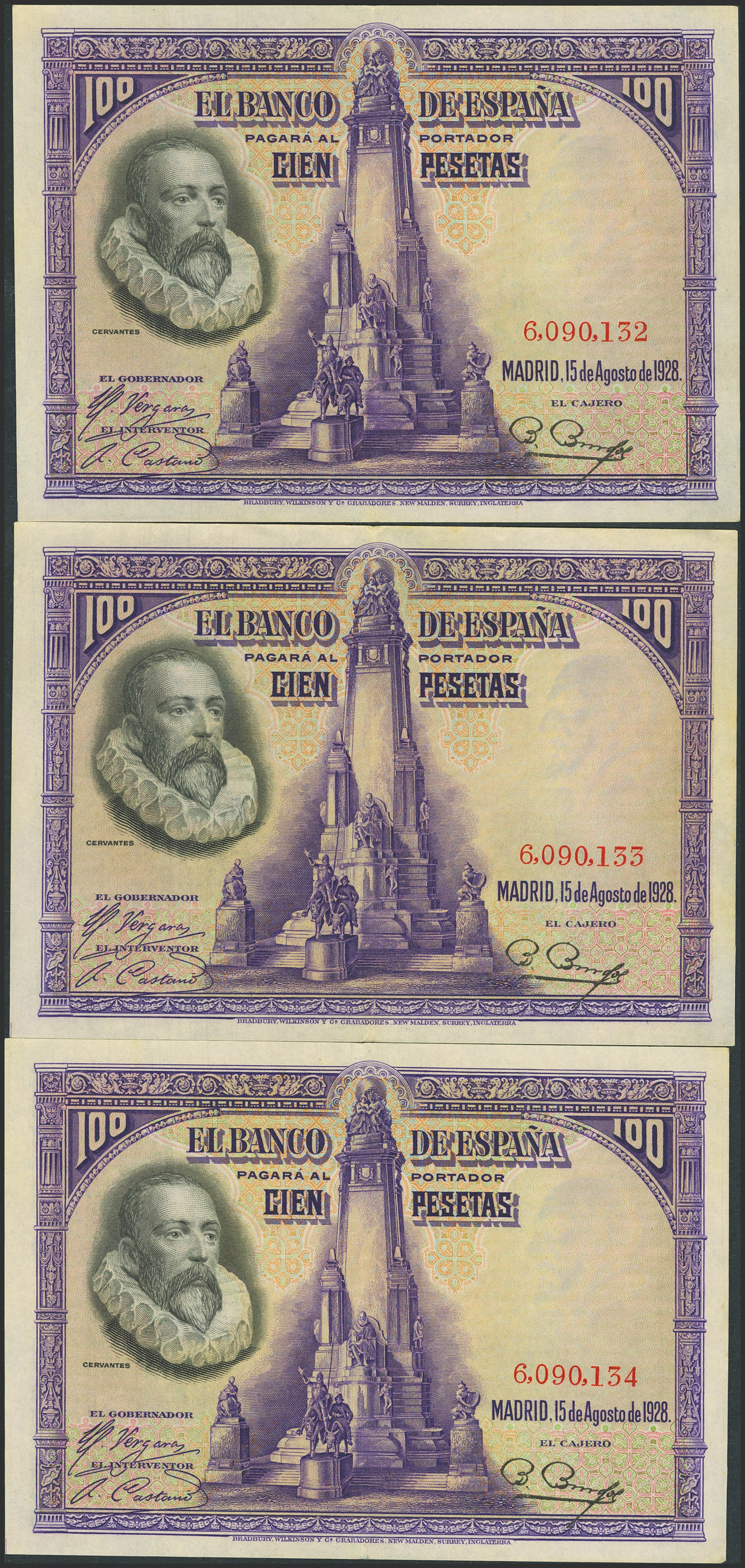 100 Pesetas. August 15, 1928. Trio of consecutive coins. No series. (Edifil 2021: 355). Unusual in this quality, original marking. Good Extremely Fine.