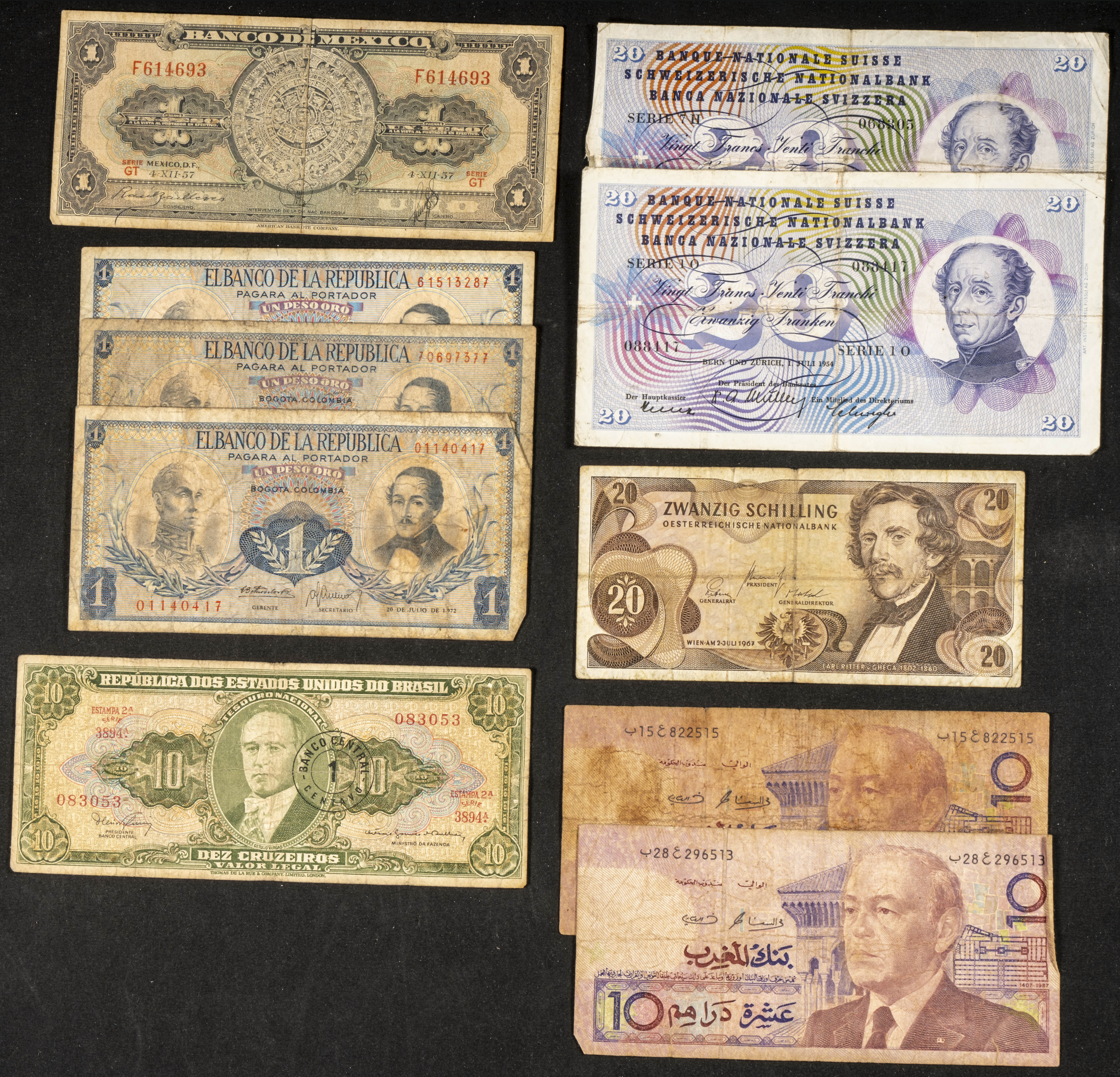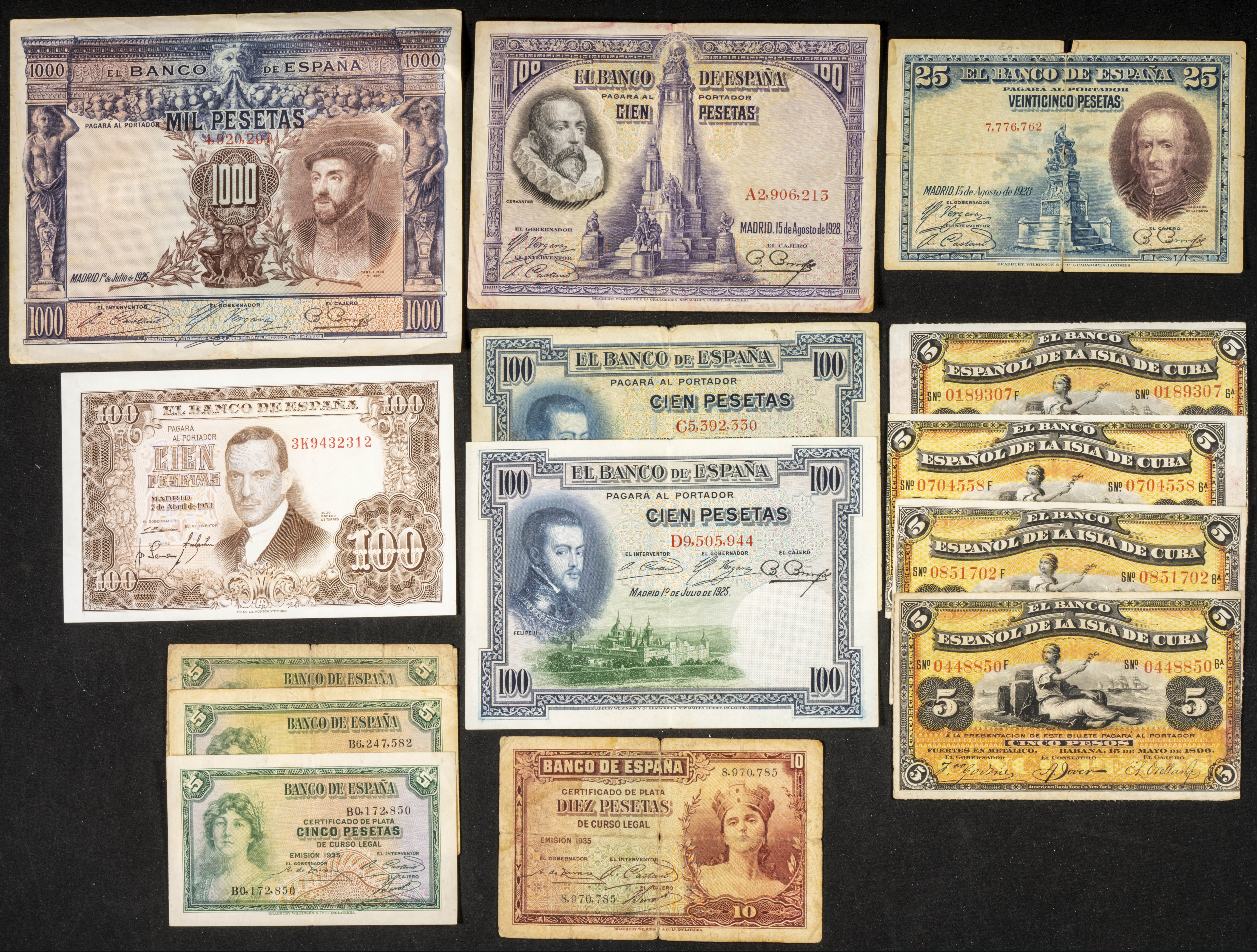 Set of 10 banknotes from the Bank of Spain of different issues, plus 4 banknotes from the Banco Español on the Island of Cuba and 10 foreign banknotes from different countries, all of them in different qualities. TO BE EXAMINED.