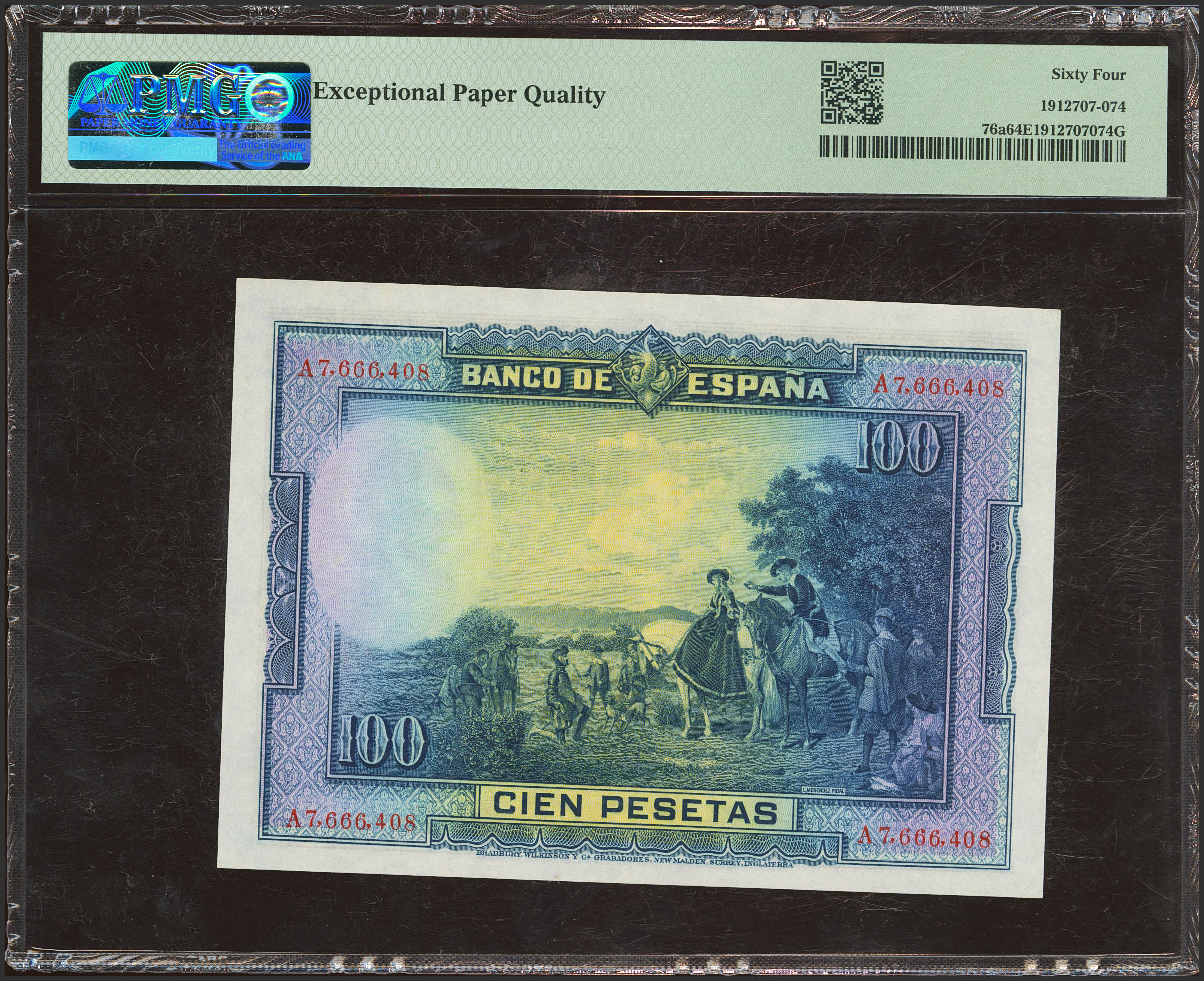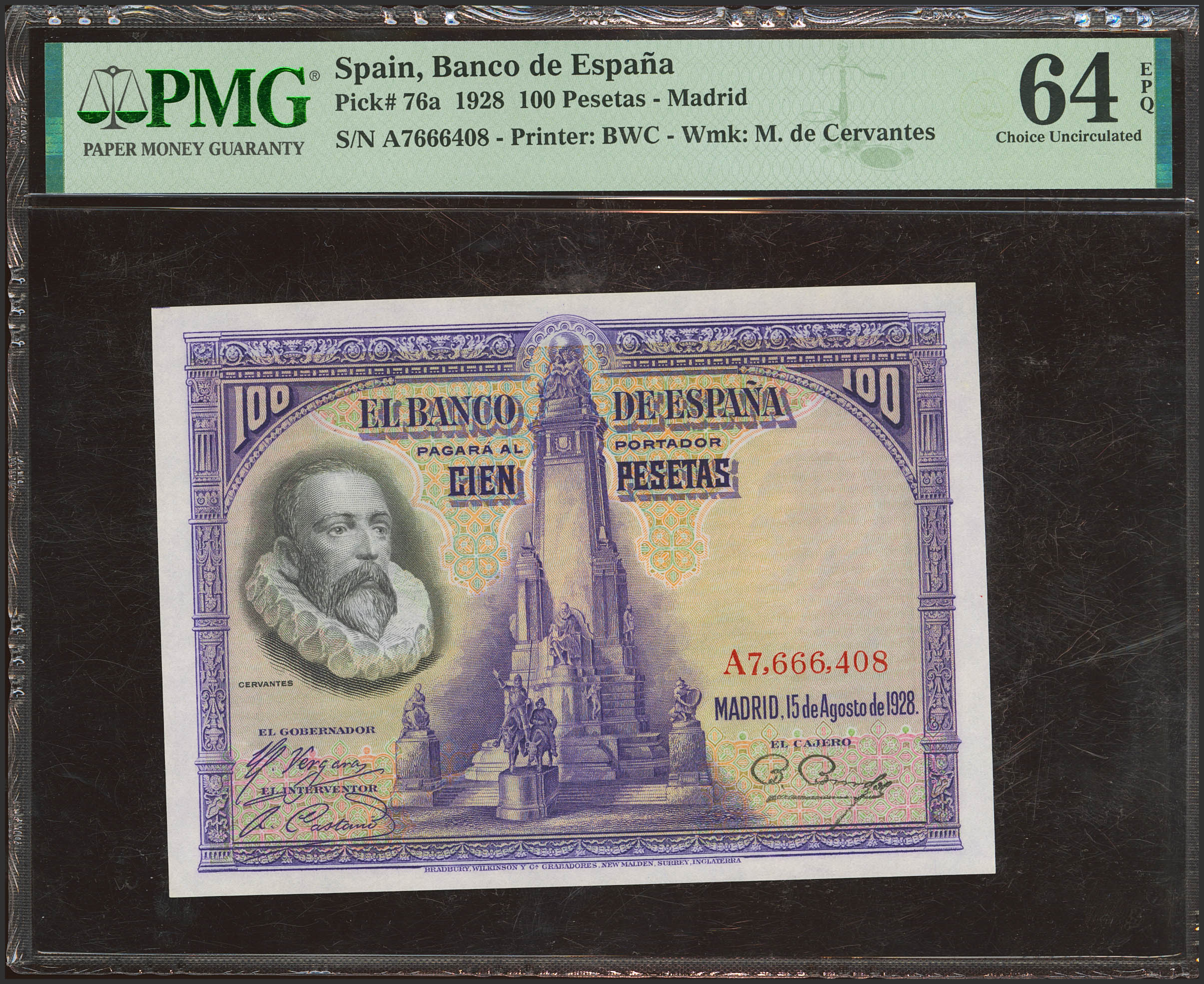 100 Pesetas. August 15, 1928. Series A. (Edifil 2021: 355a, Pick: 76a). Rare in this exceptional quality, original finish. Uncirculated. Encapsulated PMG64EPQ.