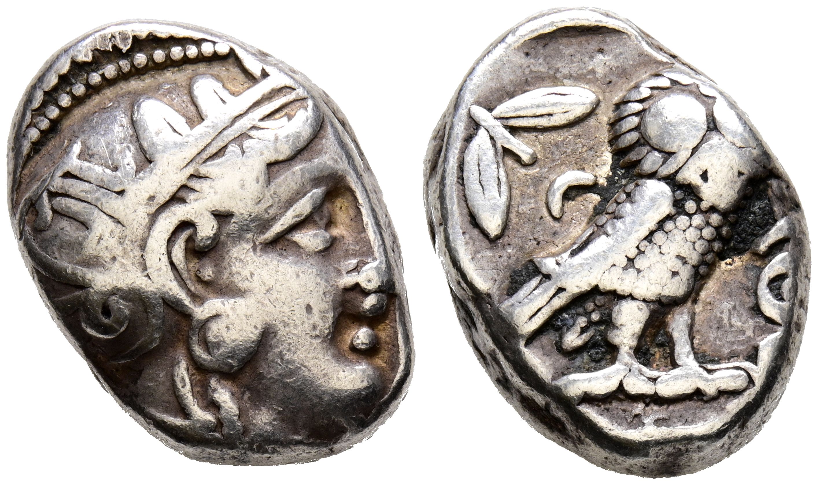 ATTICA, Athens. Tetradrachm. (Ar. 17.03g/24mm). 454-404 Fine (SNG Copenhagen 31). Obv: Head of Athena wearing Attic helmet with crest right. Reverse: Owl standing right facing front, front: AOE, back: olive branch. VF.