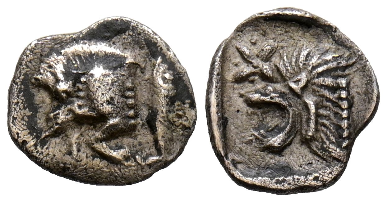 MISIA, Cyzicus. Obolo. (Ar. 0.34g/9mm). 450-400 Fine (Klein 265). Obv: Front of boar left, back tuna. Reverse: Lion's head left within incuse square. VF.
