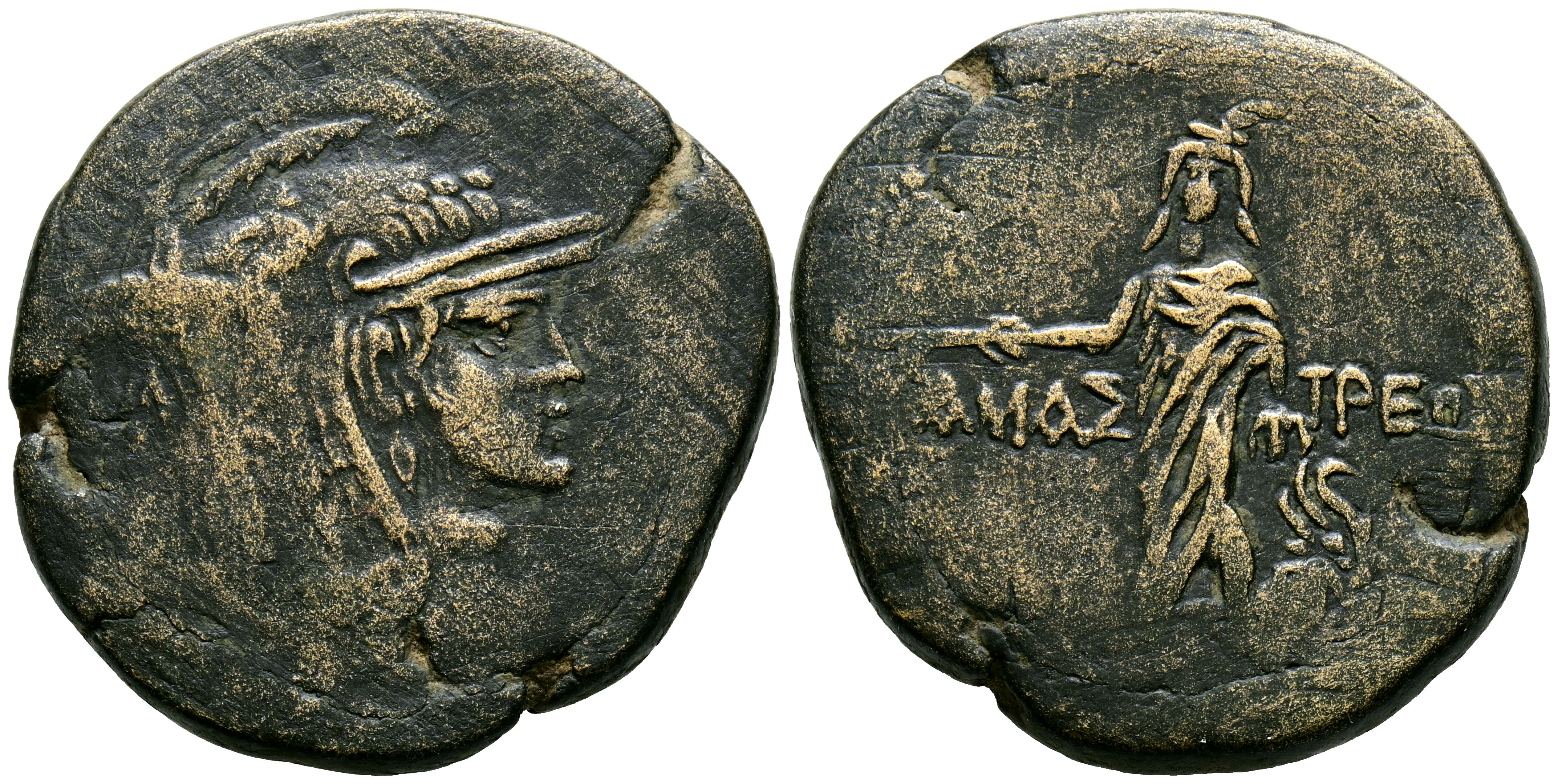 PONTOS, Amisos. Time of Mithridates VI Eupator. Ae31. (Ae. 18.40g/31mm). 85-65 Fine (SNG Stancomb 683-686 var). Obv: Head of Athena with helmet right. Rev: Perseus standing facing forward holding harp and head of Medusa, whose decapitated body lies at his feet, on either side Greek legend: ΑΜΙ-ΣΟΥ and flanking monograms. Good Fine.