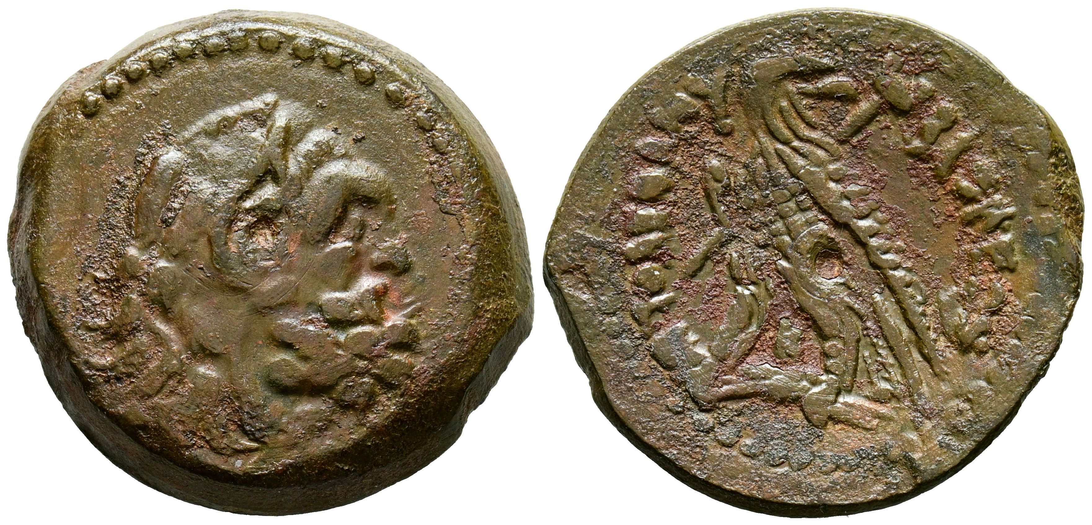PTOLEMAIC KINGDOM, Ptolemy IV Philopator. Ae24. (Ae. 10.61g/24mm). 211-204 Fine (Seaby 7842). Obv: Laureate head of Zeus right. Rev: Eagle standing on lightning bolt left looking right, between SE legs, Greek legend around. VF/VF-.