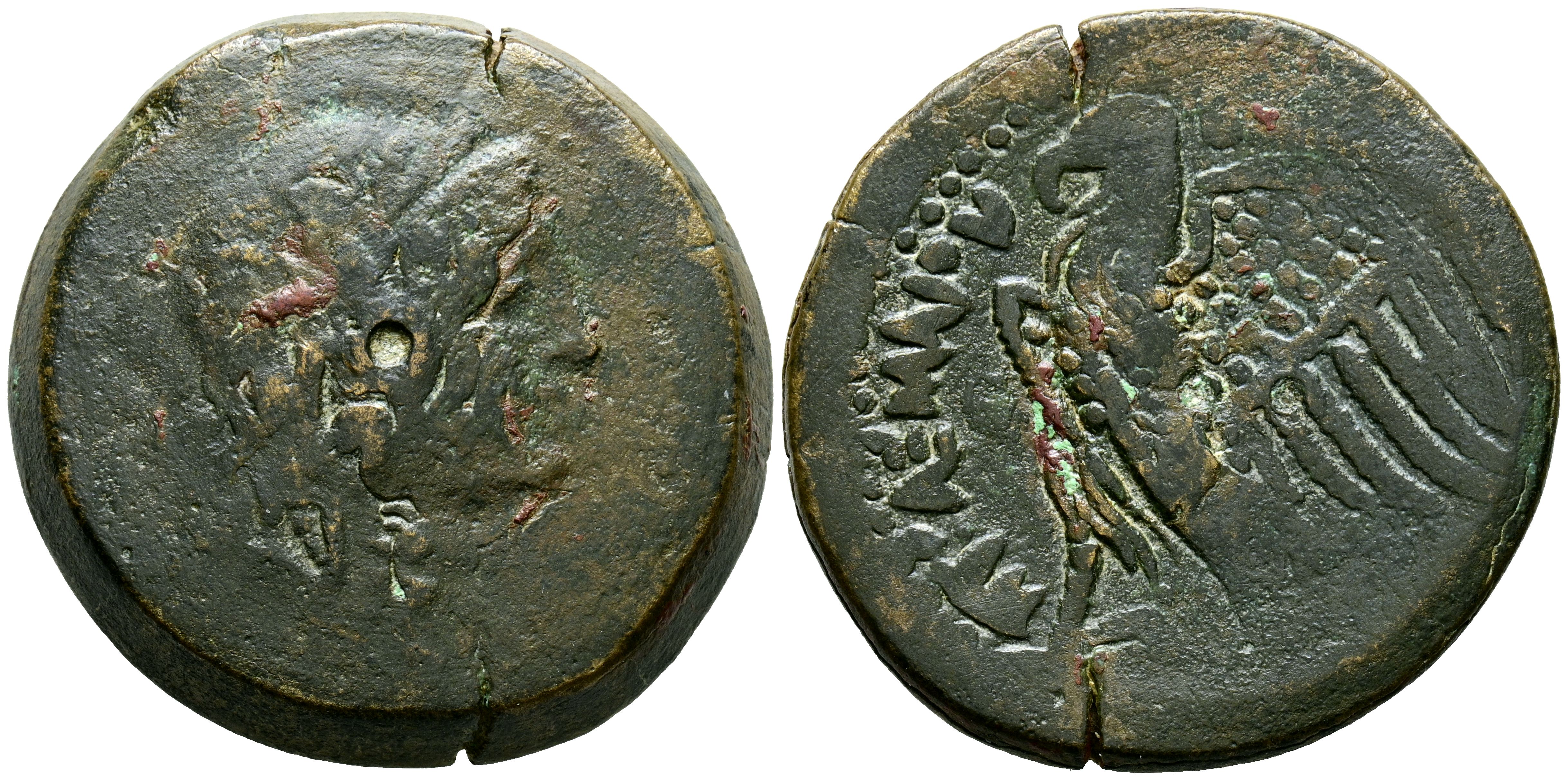 English PTOLEMAIC KINGDOM. Ptolemy VIII Euergetes II. Ae.34. (Ae. 32.21g/34mm). 145-116 Fine. Alexandria. (Svoronos 1491; SNG Copenhagen 332). Obv: Head of Isis with diadem right. Rev: Standing eagle left on a thunderbolt. VF-.