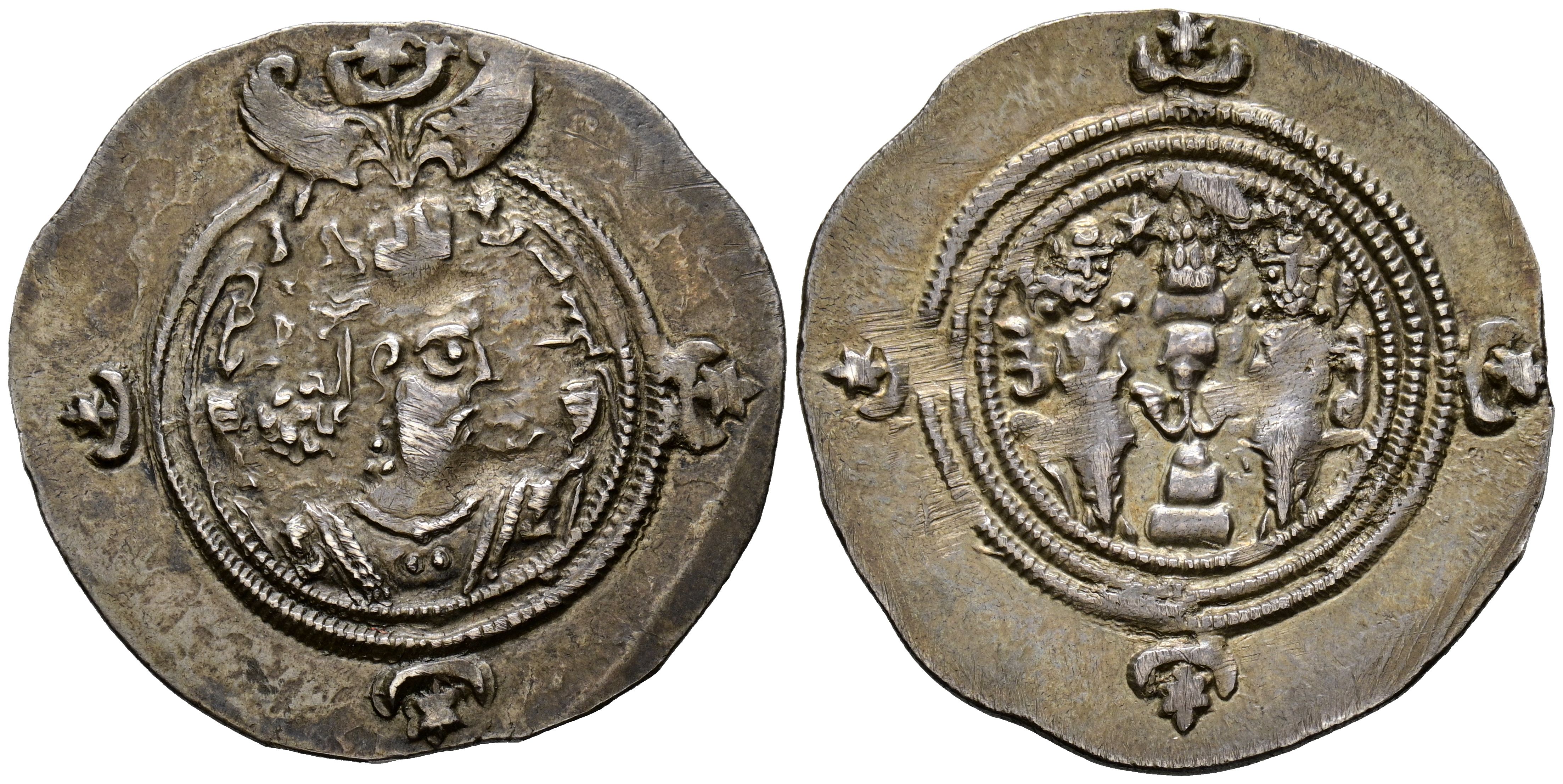 English SASANID EMPIRE, Khusro II. Drachma. (Ar. 4.08g/32mm). Year 36 PYE/625-6 AD YZ (Yazd). (Göbl-II/3). Obv: Crowned and draped bust of Khusro II right, around legend on palavhi: on the right, ABZUD (Growth) and on the left, GDH (Splendour) all within a double circular bezel. On the outside, at 3h, 6h and 9h, crescent and star. Reverse: Fire altar flanked by two priests, on the right mintmark: YZ (Yazd), and on the left year of mintage: 36 (Post Yazgard Era) within 3 borders, on the outside, at 12h, 3h, 6h and 9h crescent and star. VF.