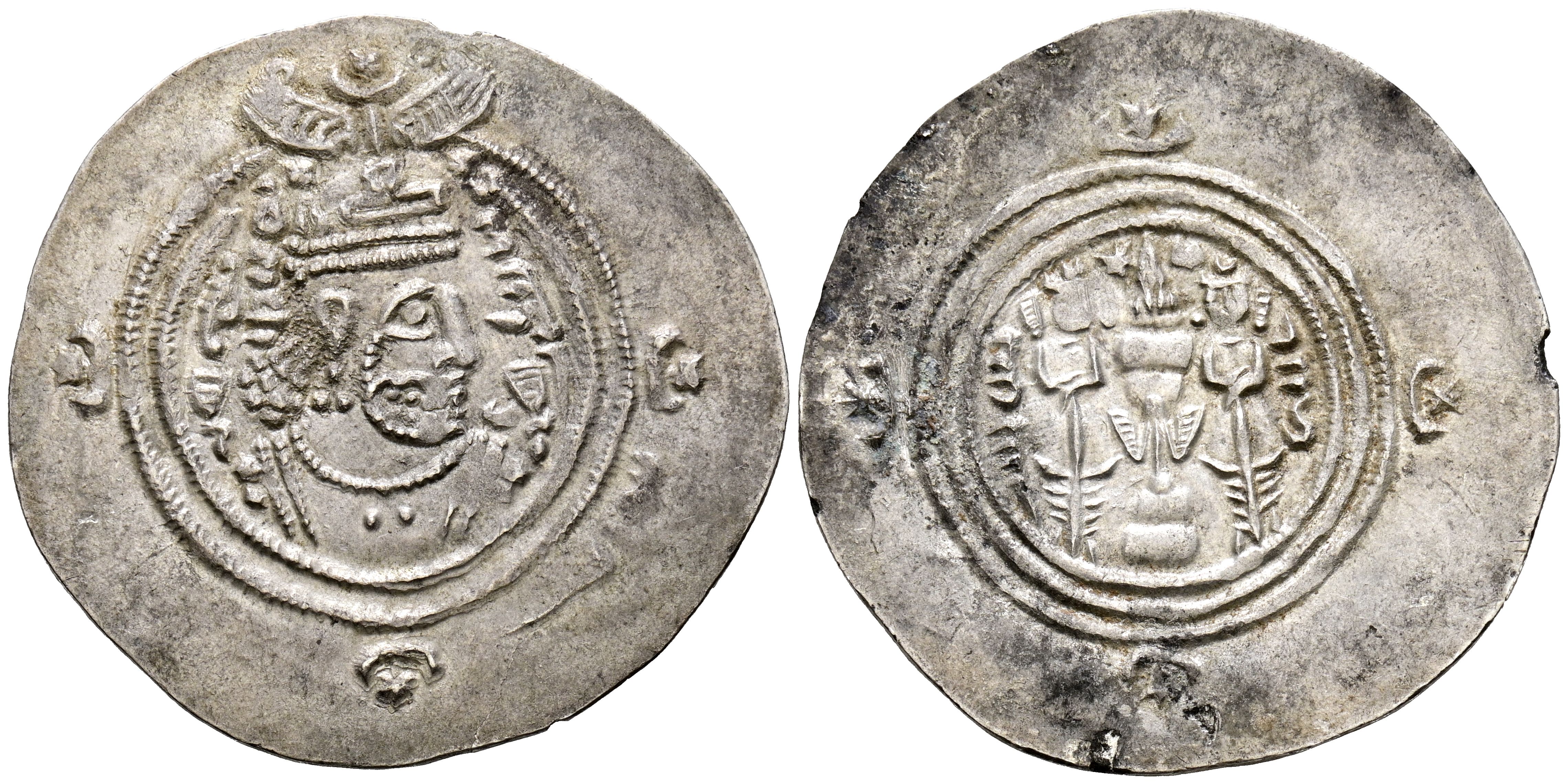 English SASANID EMPIRE, Khusro II. Drachma. (Ar. 4.03g/32mm). Year 37 PYE/626-7 AD WYHC (Place uncertain, possibly in Fars or Central Iraq). (Göbl-IIIb/3: Mochiri ENIS II 694). Obv: Crowned and draped bust of Khusro II right, around legend on palavhi: on the right, ABZUD (Growth) and on the left, GDH (Splendour) all within a double circular bezel. On the outside, at 3 o'clock, 6 o'clock and 9 o'clock, crescent and star, while at 5 o'clock it also contains the word: 'APD' (praise). Rev: Fire altar flanked by two priests, on the right mintmark: WYHC, and on the left year of minting: 37 (Post Yazgard Era) within 3 borders, on the outside, at 12h, 3h, 6h and 9h crescent and star. VF+. Slight oxidations on reverse. Attractive specimen.