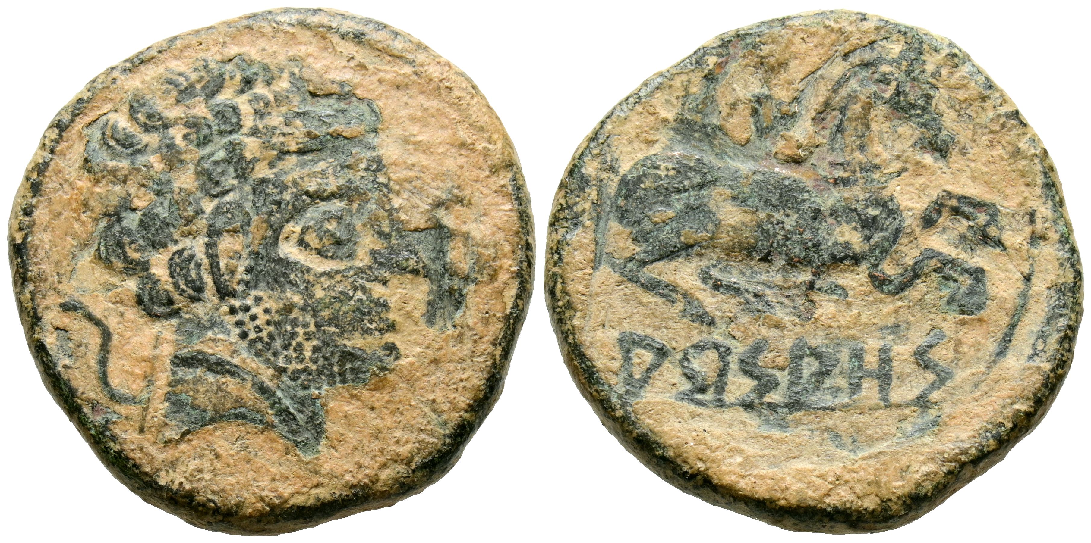 ARSAOS (Navarre area). As. (Ae. 11.03g/25mm). 120-80 Fine (FAB-144). Anv: Bearded male head to the right between two dolphins. Reverse: Rider with dart to the right, below legend on line: ARSAOS. VF-.