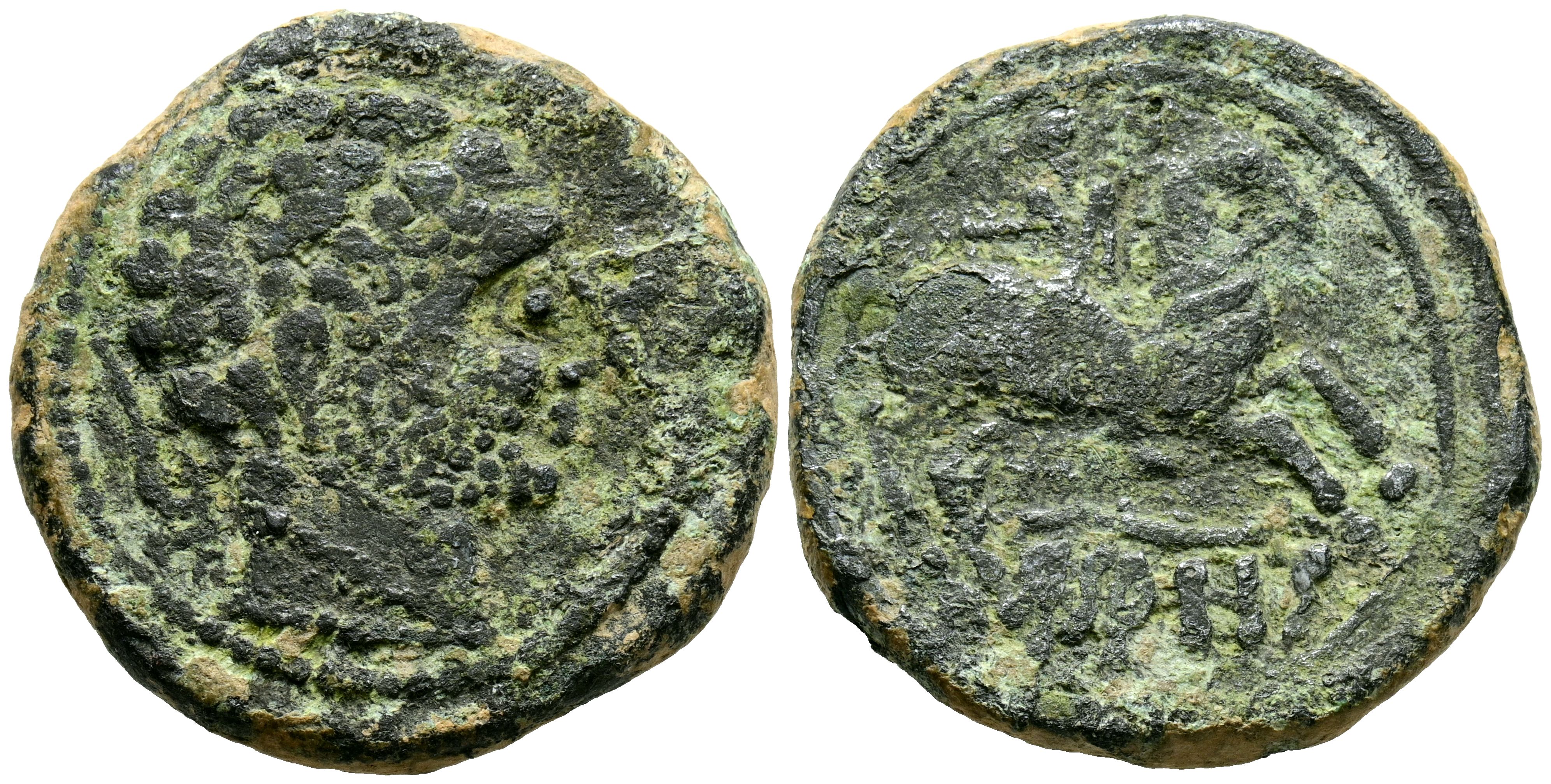 ARSAOS (Navarre area). As. (Ae. 13.60g/28mm). 120-80 Fine (FAB-145). Anv: Bearded male head facing right between two dolphins, degenerate art. Reverse: Horseman with dart facing right, below legend line: ARSAOS, degenerate art. VF-.