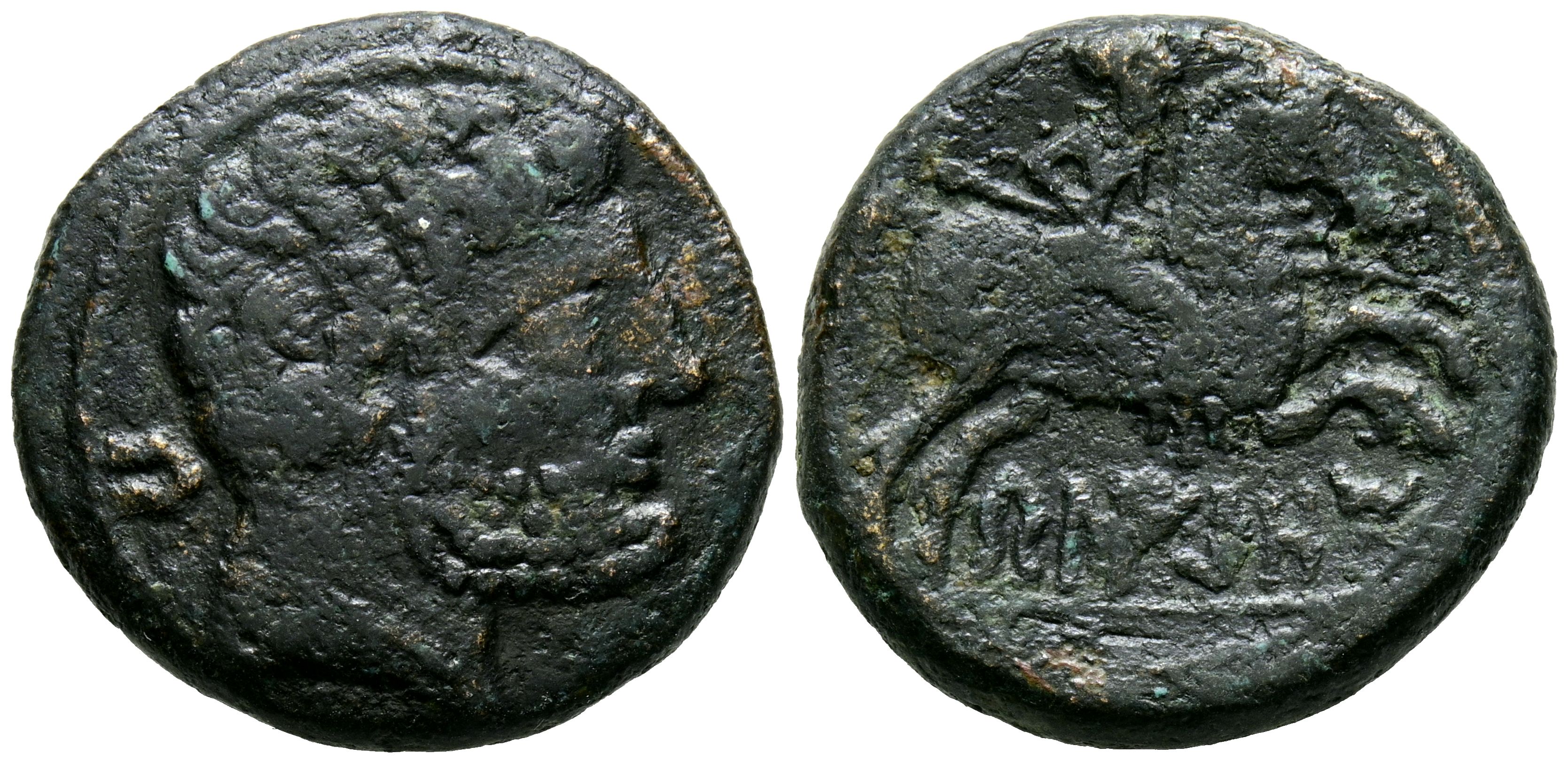 BELIGIOM (Belchite, Zaragoza). As. (Ae. 10.17g/23mm). 120-20 Fine (FAB-243). Anv: Bearded male head facing right, behind Iberian letter: Be. Rev: Horseman with lance facing right, below Iberian legend: BeLIGiOM. VF-.