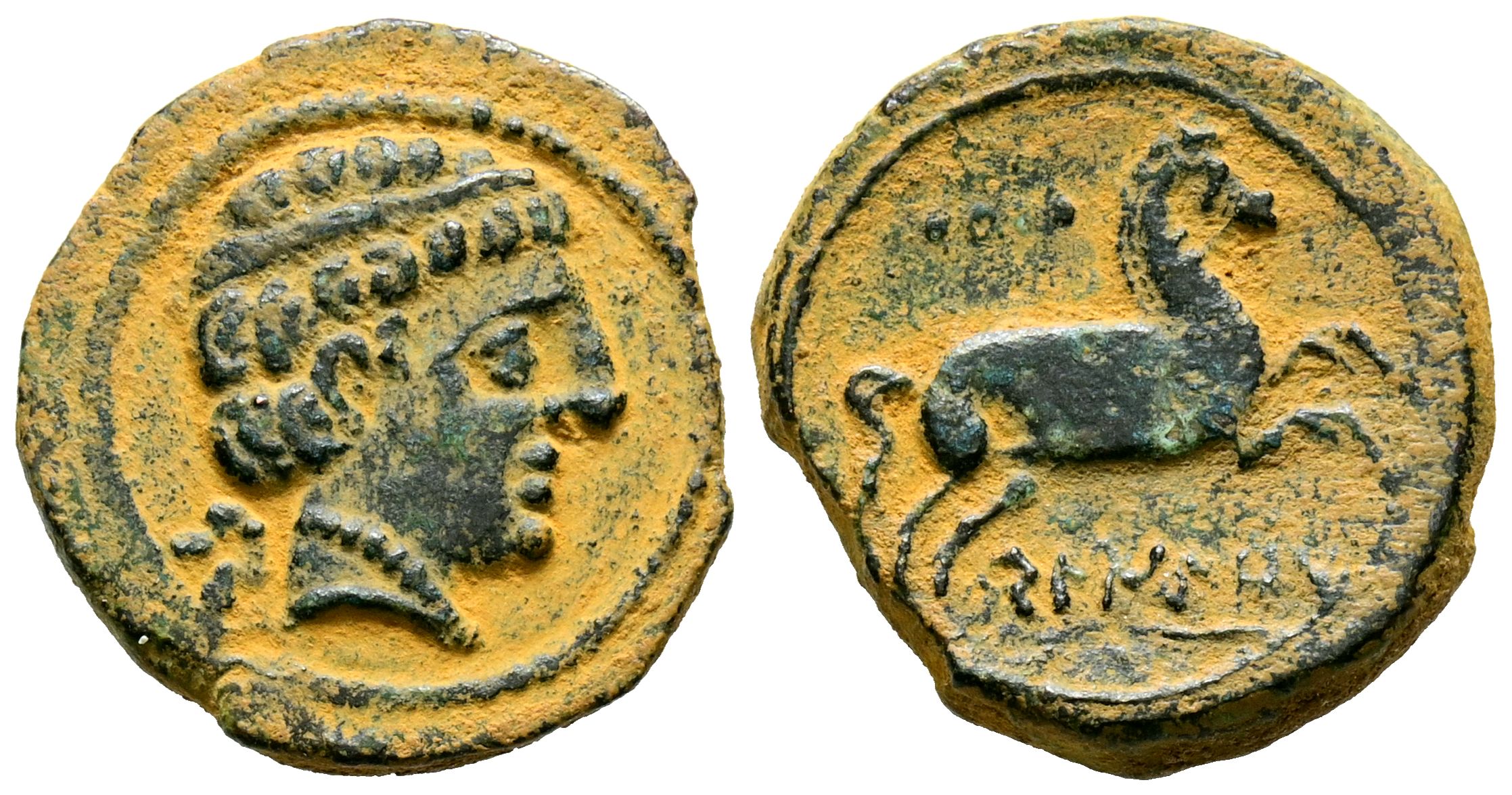 English BELIGIOM (Belchite, Zaragoza). Quadrant. (Ae. 2.43g/16mm). 180-20 Fine (FAB-247). Obverse: Diademed head to the right, behind Iberian letter Be. Reverse: Horse leaping to the right, above three dots and below Iberian legend: BELIGio. Extremely Fine-.