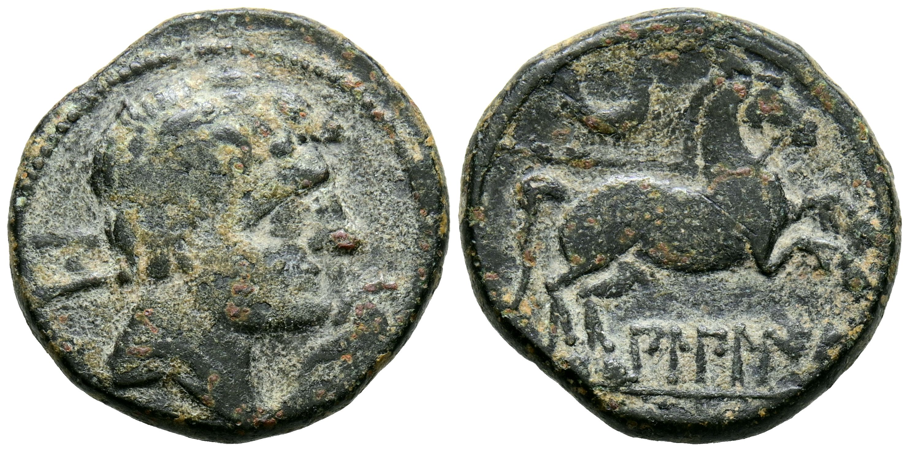 English BILBILIS (Calatayud, Zaragoza). Semis. (Ae. 5.94g/21mm). 120-30 Fine (FAB-266). Anv: Male head to the right, behind Iberian letter S, in front dolphin. Reverse: Horse leaping to the right, above crescent, below Iberian legend: BiLBiLIS. VF.
