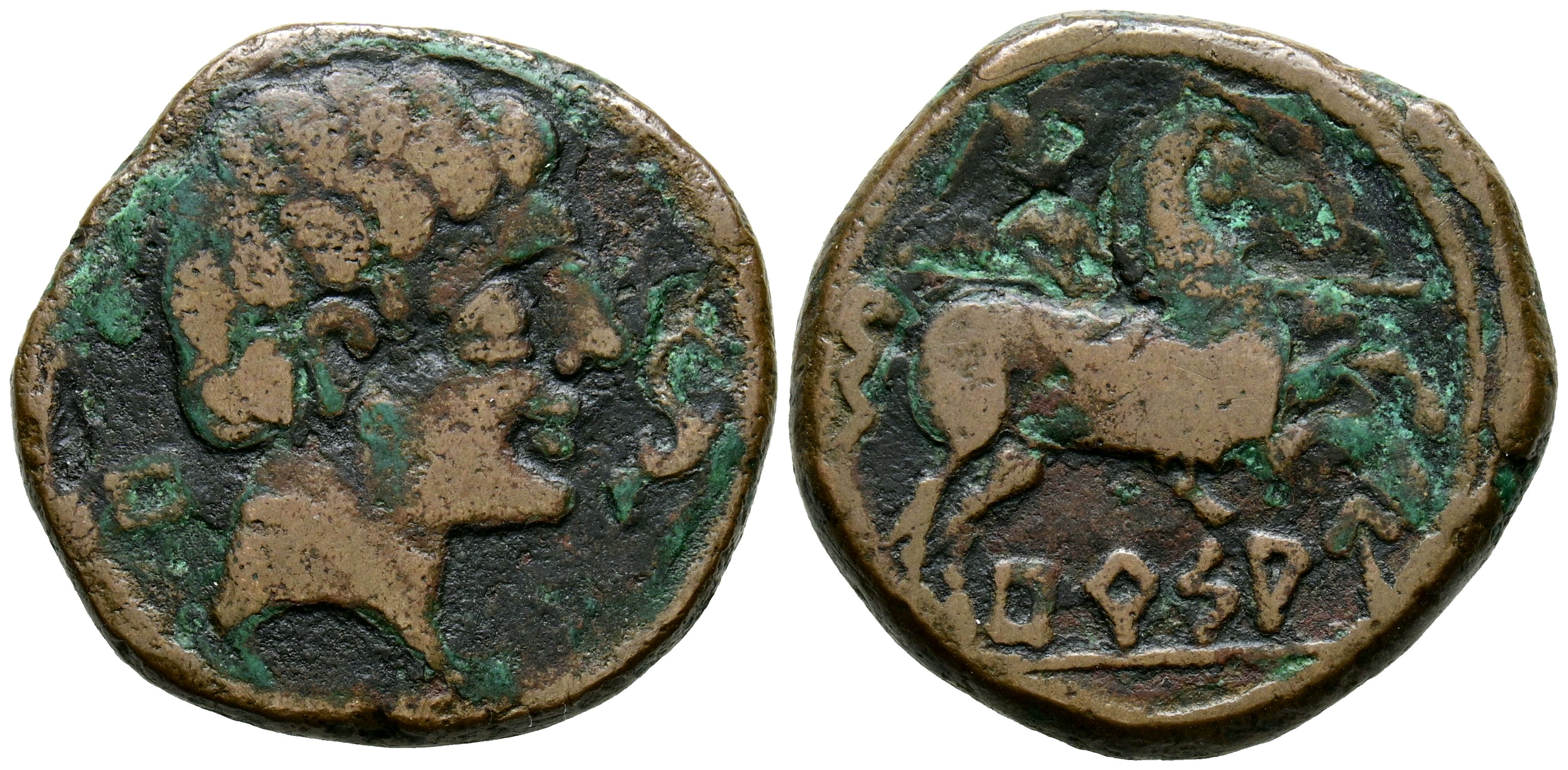 BURSAU (Borja, Zaragoza). As. (Ae. 10.90g/25mm). 120-80 Fine (FAB-298). Anv: Bearded male head to right, behind letter: Bu, in front dolphin. Reverse: Horseman with lance to right, above crescent, below Iberian legend: BuRSAU. VF-. Cleaned.