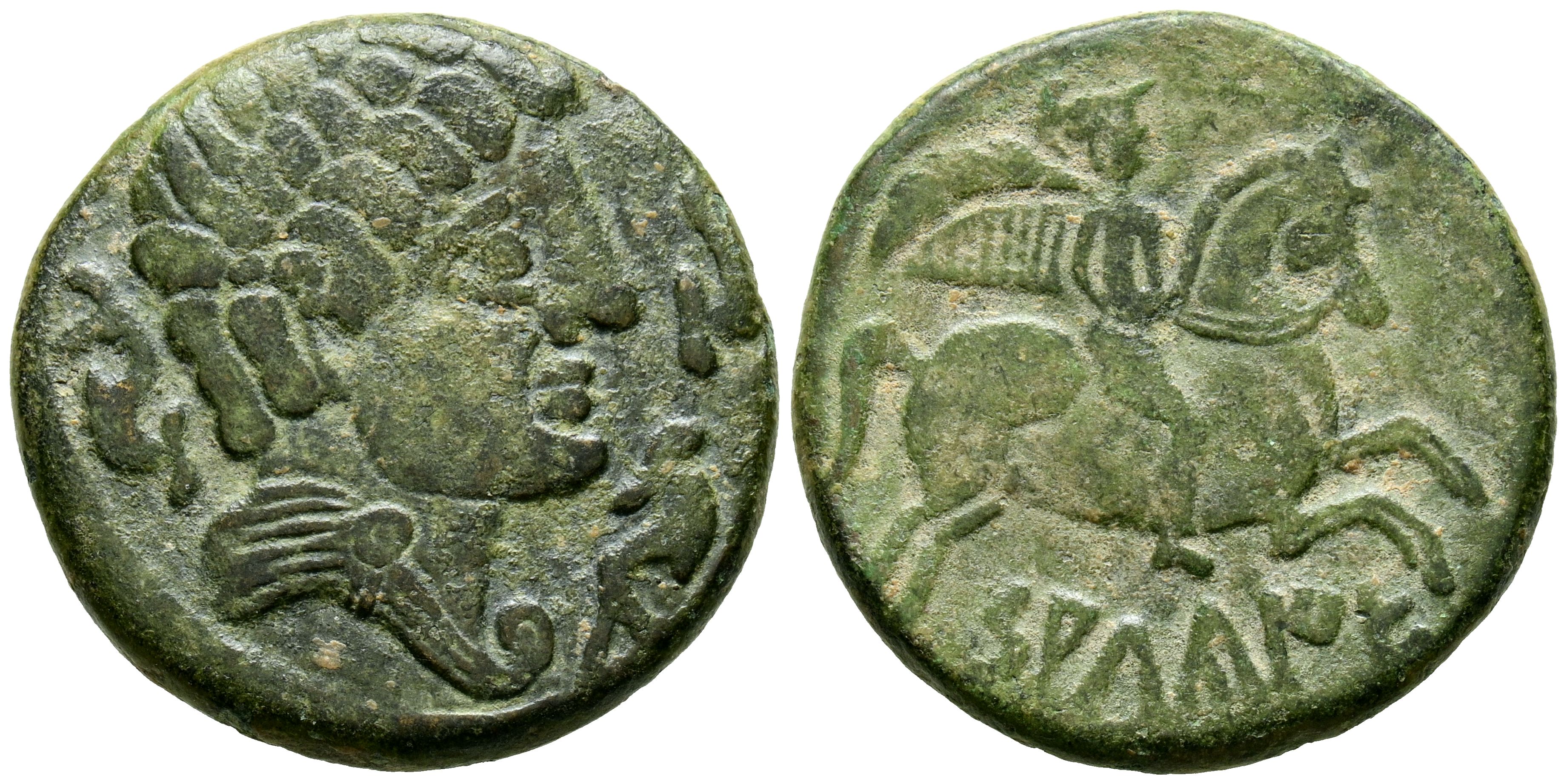 SALDUIE (Zaragoza). As. (Ae. 10.34g/26mm). 120-30 Fine (FAB-305). Obverse: Male head surrounded by three dolphins on the right. Reverse: Horseman with palm and chlamys on the right, below Iberian legend: SALuIO. VF. Green patina.