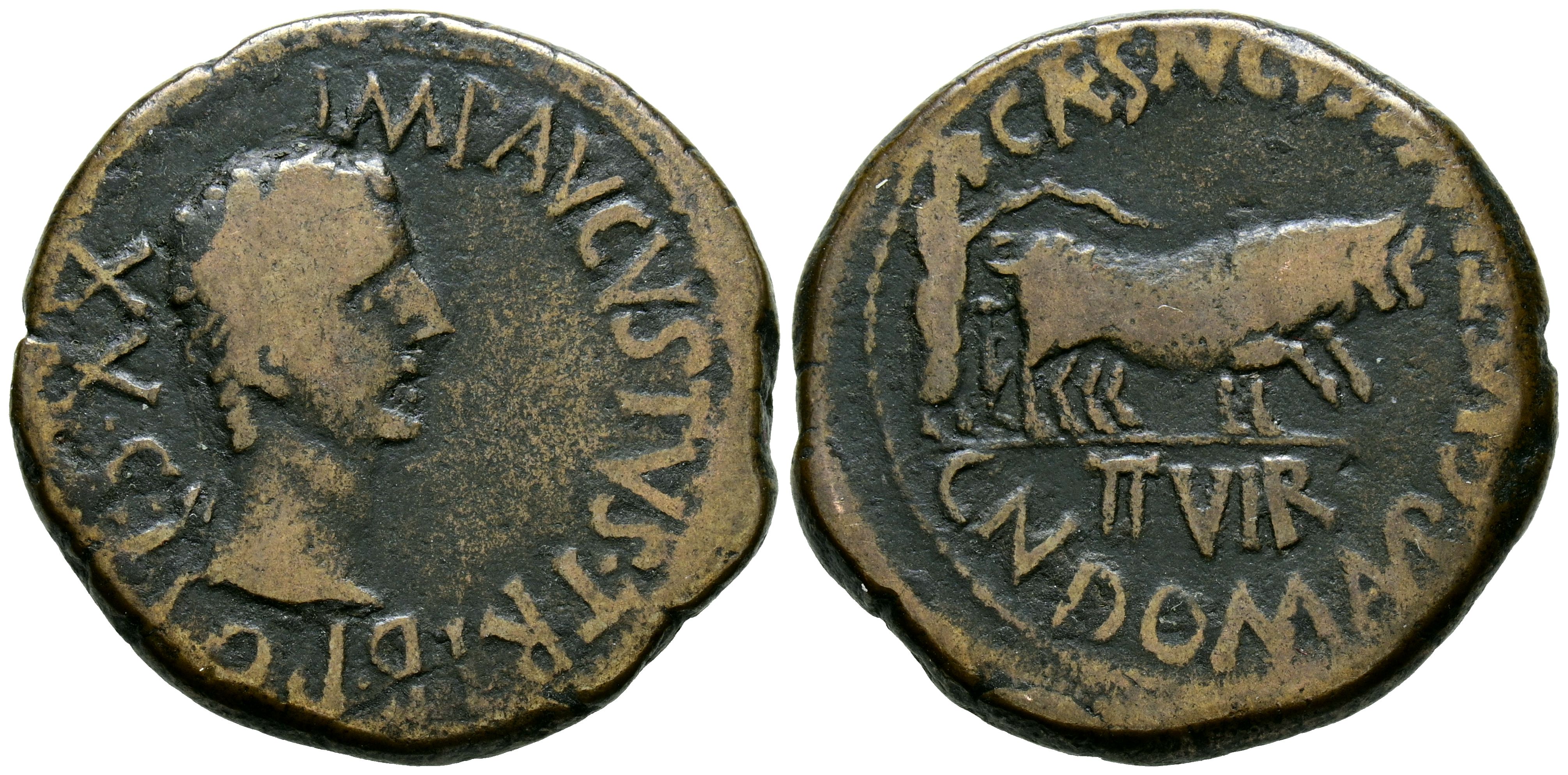 CAESARAUGUSTA (Zaragoza). As. (Ae. 11.46g/29mm). 27 Fine-14 AD (FAB-327). Obv: Laureate head of Augustus right, around legend: IMP AVGVSTVS TRIB POTES XX. Rev: Yoke right, below: II VIR, around legend: CAES AVGVS CN DOM AMP C VET LANC. Very Fine-.
