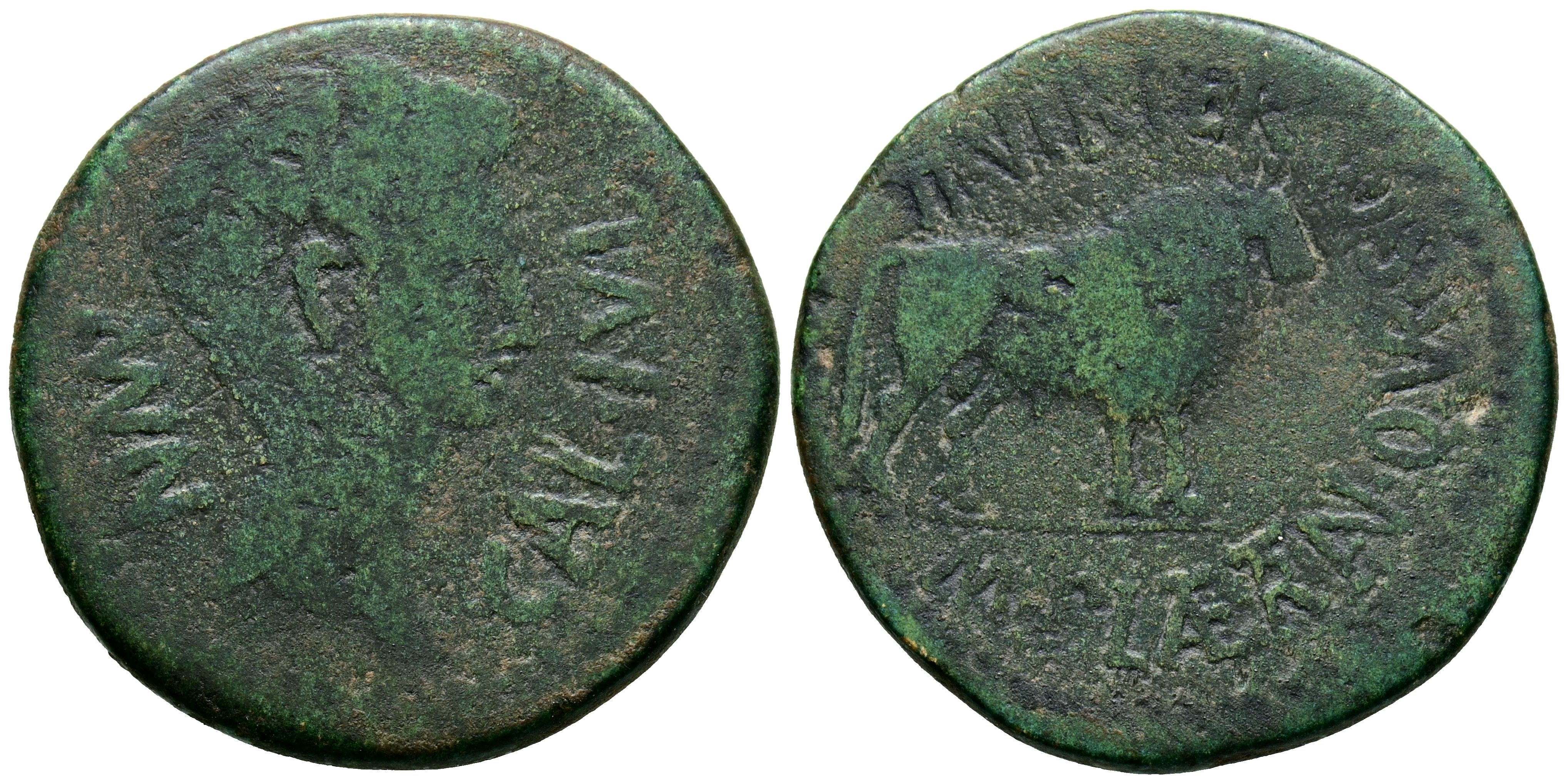 CALAGURRIS (Calahorra, La Rioja). As. (Ae. 10.80g/29mm). 27 Fine-14 AD (FAB-408). Obverse: Head of Augustus right, surrounding legend: MVN CAL IVL. Reverse: Bull right, surrounding legend: II VIR ITER M PLAET TRAN Q VRSO. Good Fine. Attractive green patina.