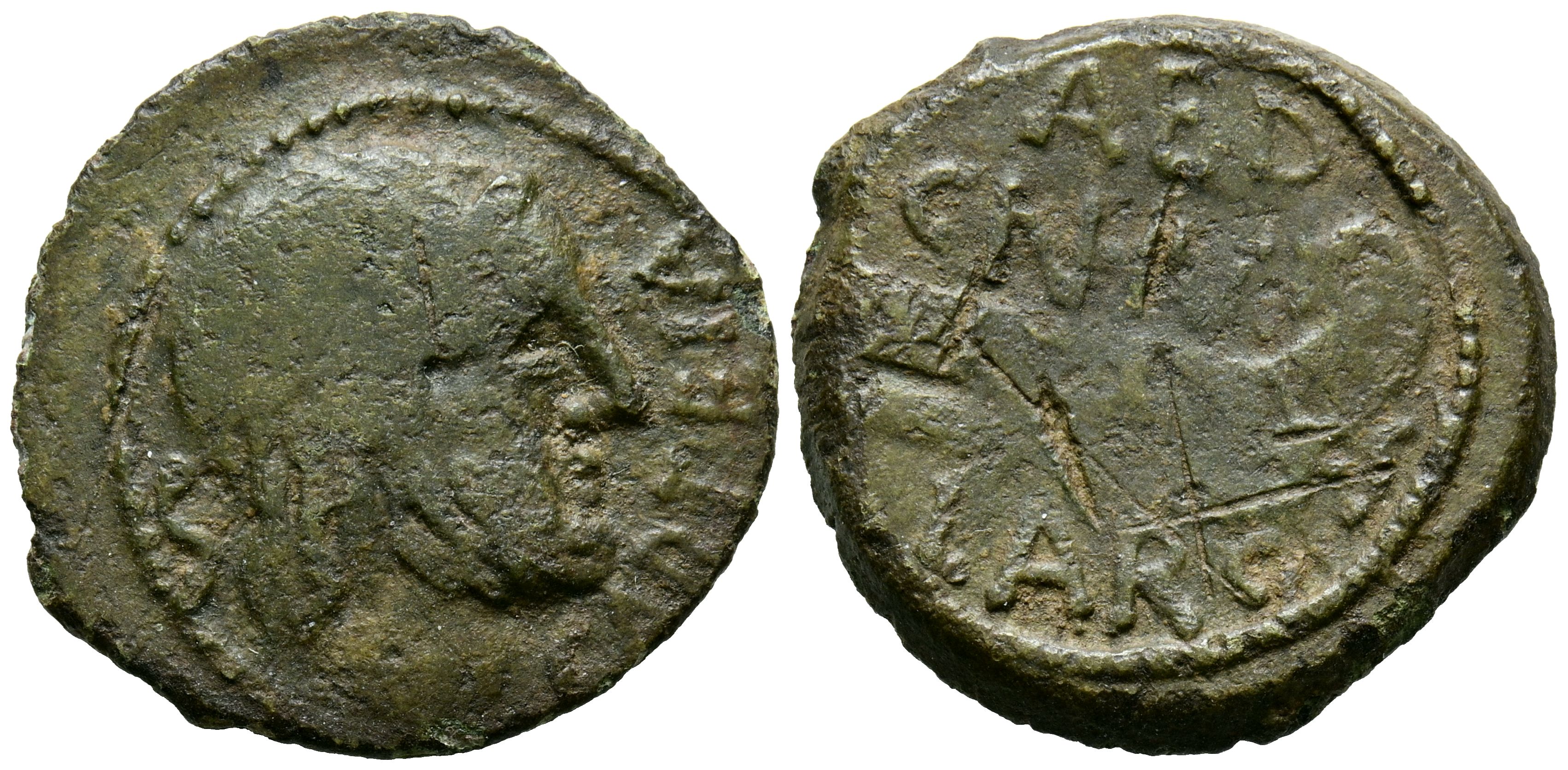 CARTEIA (San Roque, Cádiz). Semis. (Ae. 7.19g/24mm). 80-20 Fine (FAB-634). Anv: Laureate head of Jupiter right, front legend: CARTEIA, behind S. Rev: Prow right, around legend: AED CN AMI L ARG. Very Fine-/Very Fine.