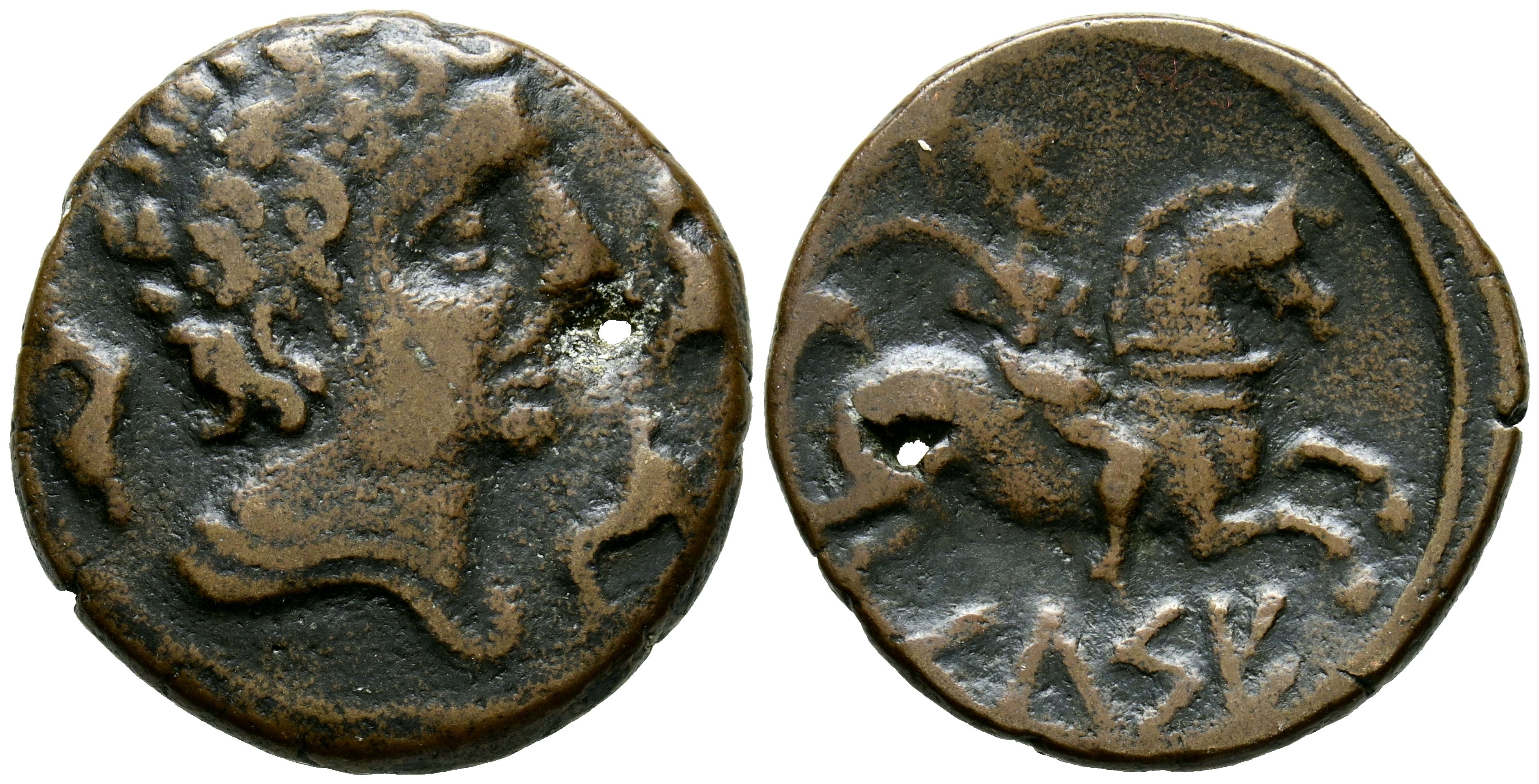 CELSE (Velilla del Ebro, Zaragoza). As. (Ae. 10.99g/27mm). 120-50 Fine (FAB-771). Anv: Male head right with cloak and fibula right, around three dolphins. Reverse: Horseman with palm to right, below Iberian legend on line: CeLSE. VF-. Cleaned and small perforation.