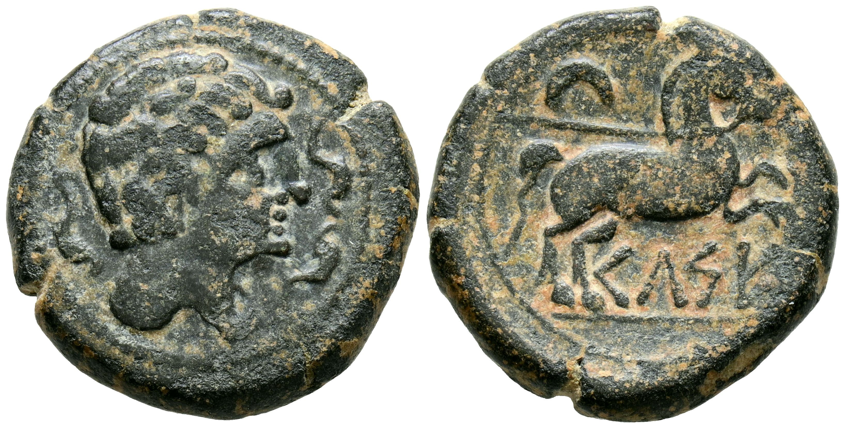 CELSE (Velilla del Ebro, Zaragoza). Semis, heavy set. (Ae. 10.08g/22mm). 120-50 Fine (FAB-782). Obv: Male head facing right surrounded by three dolphins. Rev: Horse with bridle facing right, crescent above, below Iberian legend above line: CeLSE. VF.
