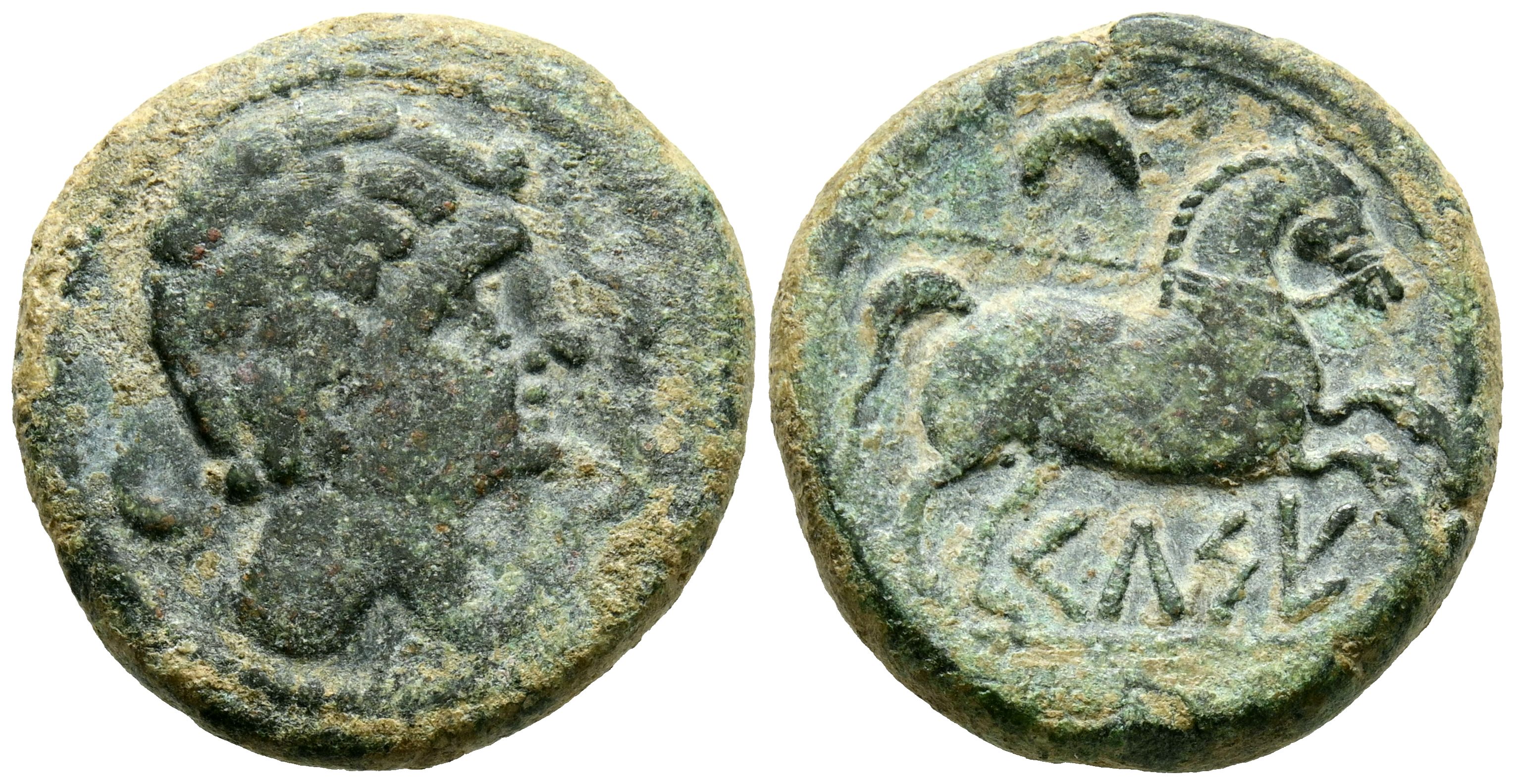 CELSE (Velilla del Ebro, Zaragoza). Semis. (Ae. 8.36g/22mm). 120-50 Fine (FAB-782). Obverse: Male head facing right surrounded by three dolphins. Reverse: Horse with bridle facing right, crescent above, below Iberian legend above line: CeLSE. Very Fine.