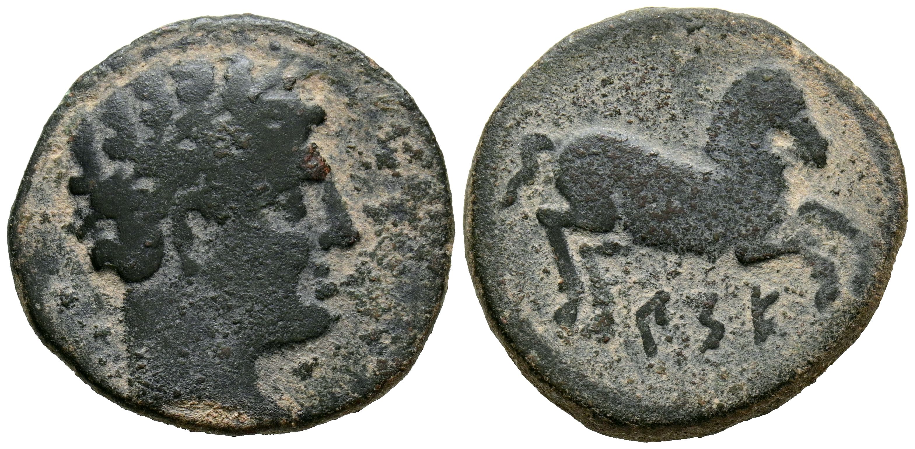 CESE (Tarragona). Semis. (Ae. 6.65g/20mm). 120-20 Fine (ACIP 1106). Anv: Male laurelled head right. Rev: Horseman right, below Iberian legend: CeSE. VF. Scarce specimen.