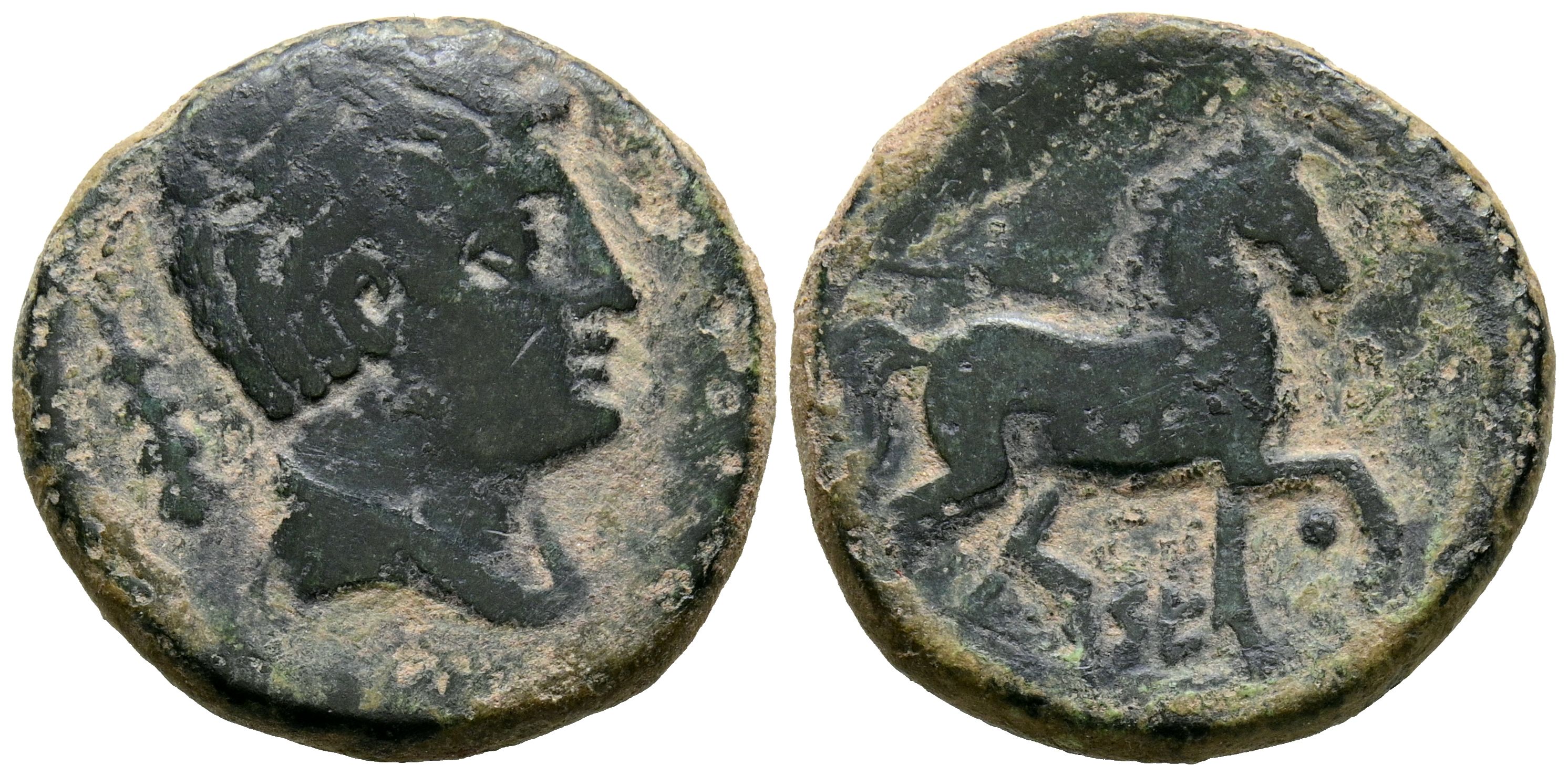 CESE (Tarragona). Semis. (Ae. 5.71g/21mm). 120-20 Fine (FAB-2307). Anv: Male head to the right, behind mace. Rev: Horse walking to the right, below Iberian legend: CeSE. Very Fine.