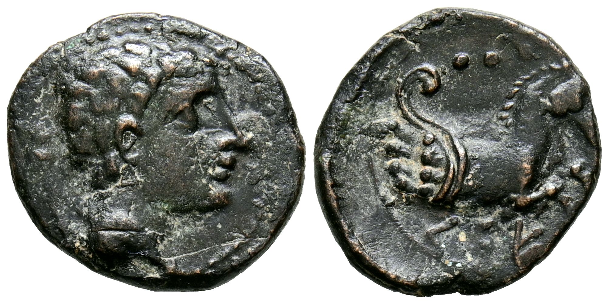 CESE (Tarragona). Quadrant. (Ae. 1.60g/14mm). 120-20 Fine (FAB-2330). Obverse: Male head to the right, caduceus behind. Reverse: Front of pegasus to the right, three points above, below Iberian legend: CeSE. Very Fine.