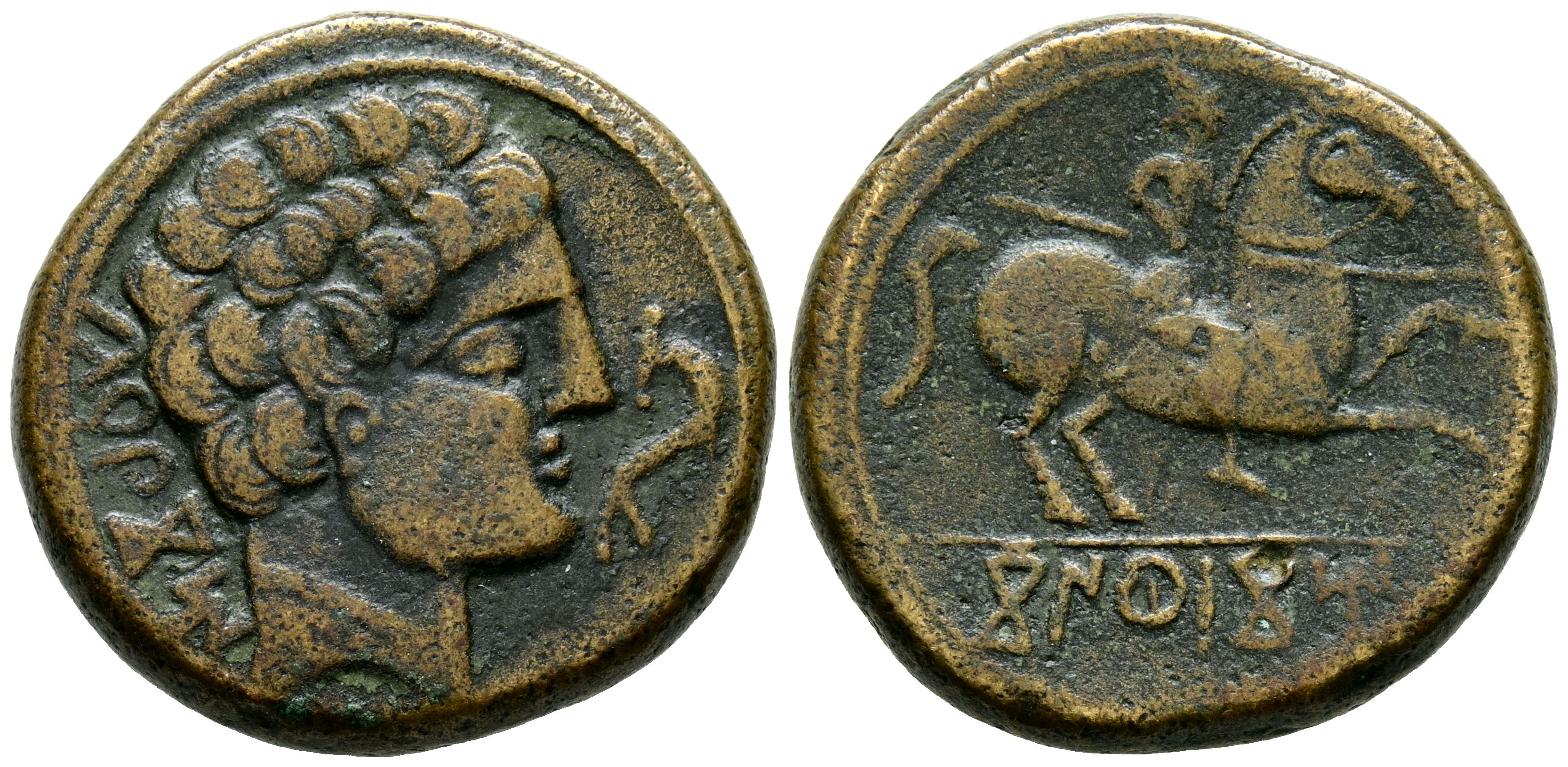 CONTERBIA CARBICA (Huete, Cuenca). As. (Ae. 11.37g/24mm). 120-80 Fine (FAB-847). Anv: Male head to right, behind legend: CaRBiCoM, in front dolphin. Rev: Horseman with lance to right, below Iberian legend below line: CoNTeBaCoM. VF.