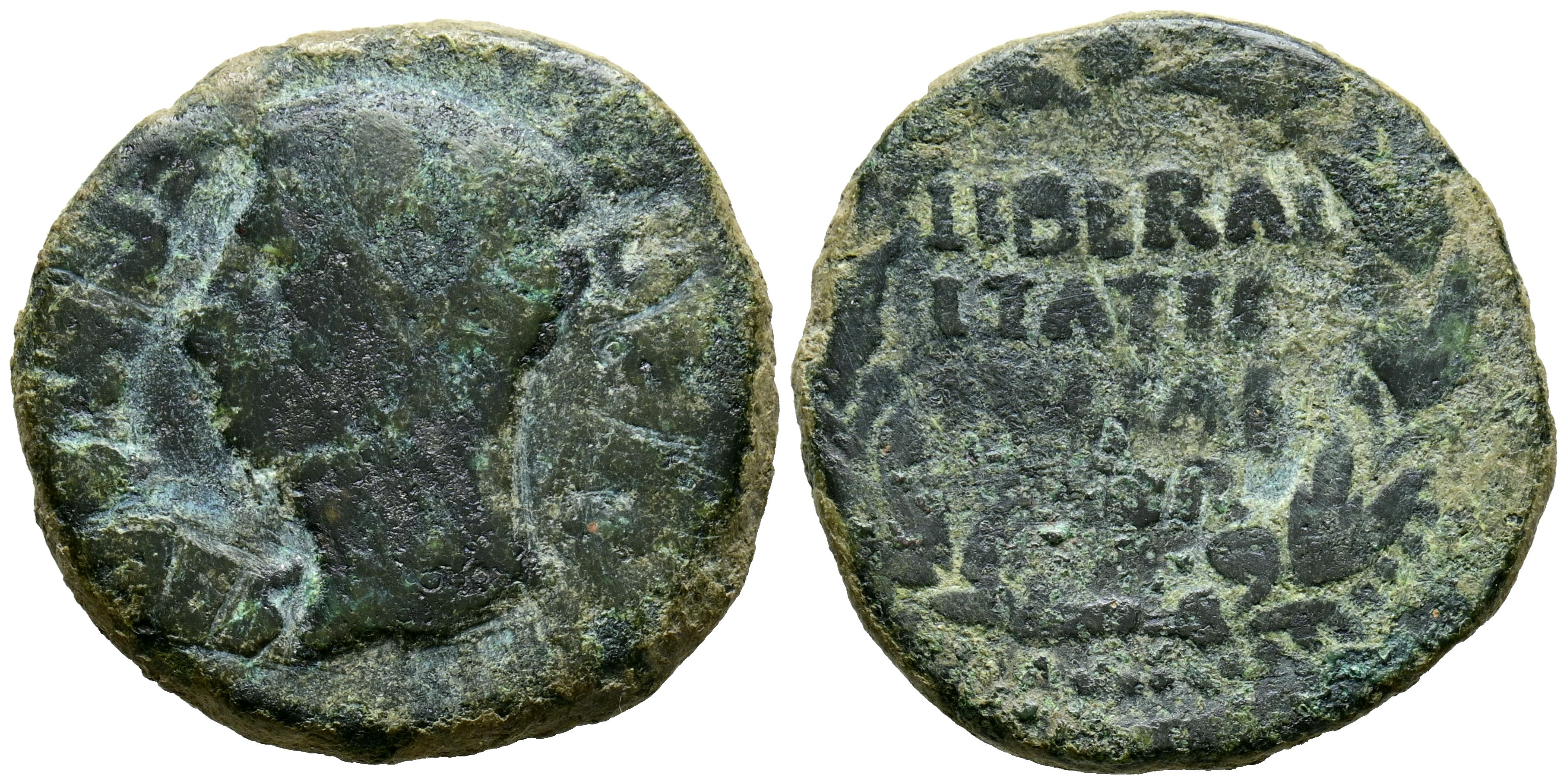 EBORA (Évora, Portugal). As. (Ae. 9.26g/26mm). 27 Fine-14 AD (FAB-902). Anv: Head of Augustus to the left, around legend: PERM CAES AVG P M. Rev: Láurea, inside legend in three lines: LIBERAL IVLIAE EBOR. Fine.