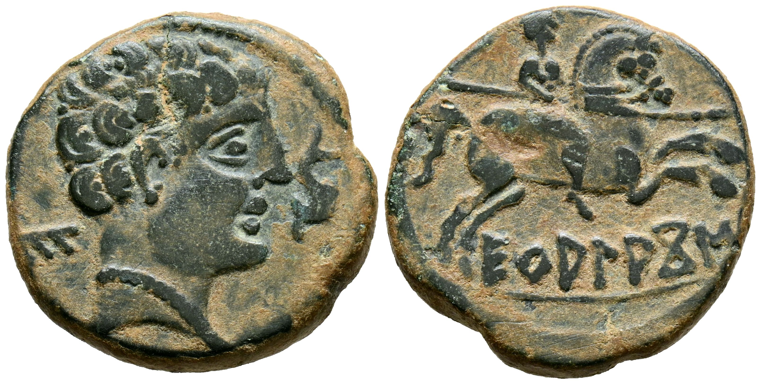 ECUALACOS (Soria-Guadalajara area). As. (Ae. 7.24g/22mm). 120-20 Fine (FAB-969). Anv: Male head to the right, in front a dolphin, behind it Iberian letter: E. Rev: Horseman with lance to the right, below legend: ECuALACoS. Very Fine.