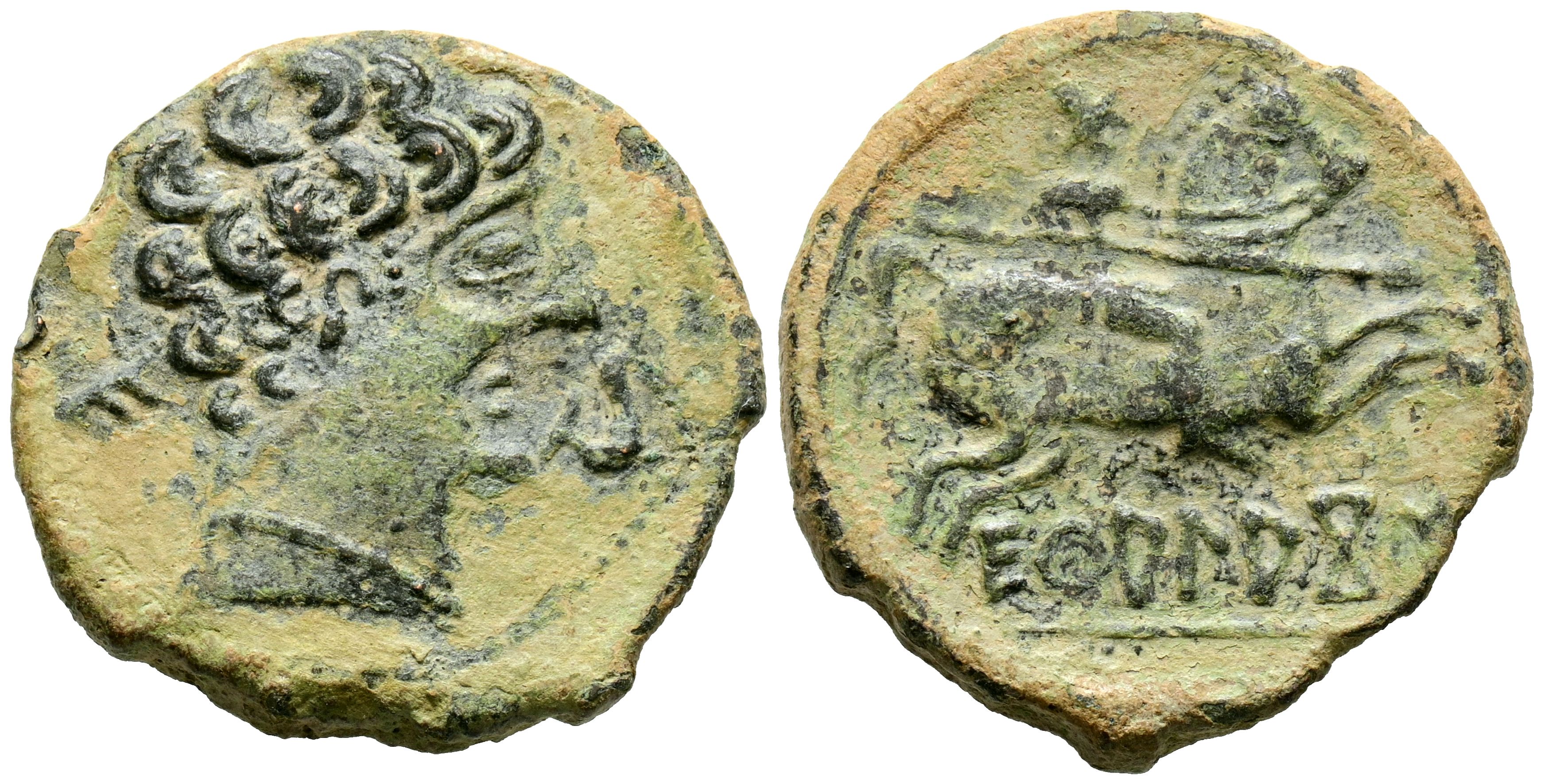 ECUALACOS (Soria-Guadalajara area). As. (Ae. 8.24g/24mm). 120-20 Fine (FAB-969). Anv: Male head to the right, in front a dolphin, behind it a Iberian letter: E. Rev: Horseman with lance to the right, below legend: ECuALACoS. Very Fine-.