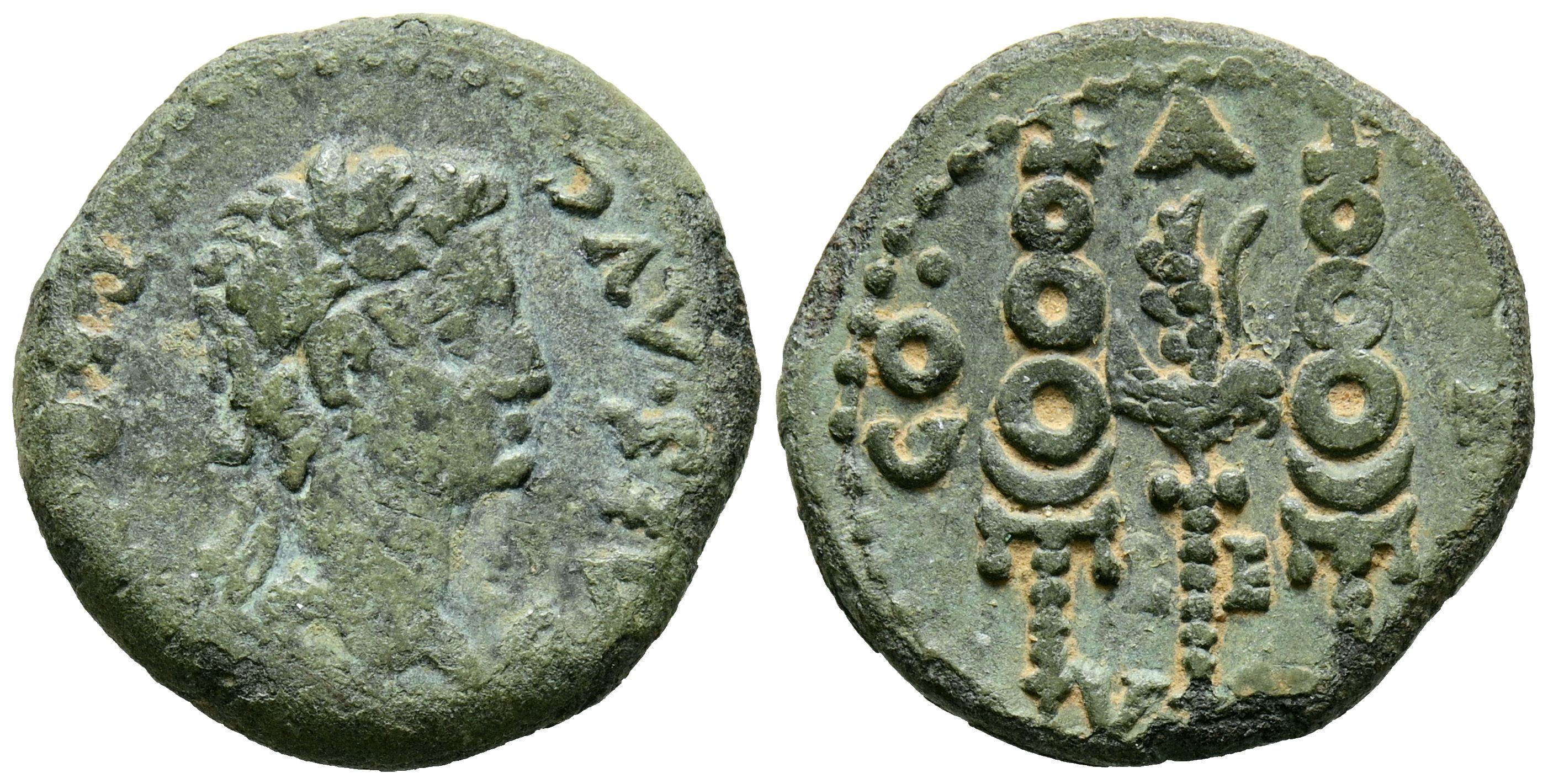 EMERITA AUGUSTA (Mérida, Badajoz). Semis. (Ae. 4.19g/19mm). 22 Fine-14 AD (FAB-1017). Obverse: Laureate head of Augustus right, around legend: PERM CAES AVG. Reverse: Insignia and legionary eagle, below: LE/VX, around legend: CO AE. Very Fine/Good Very Fine.
