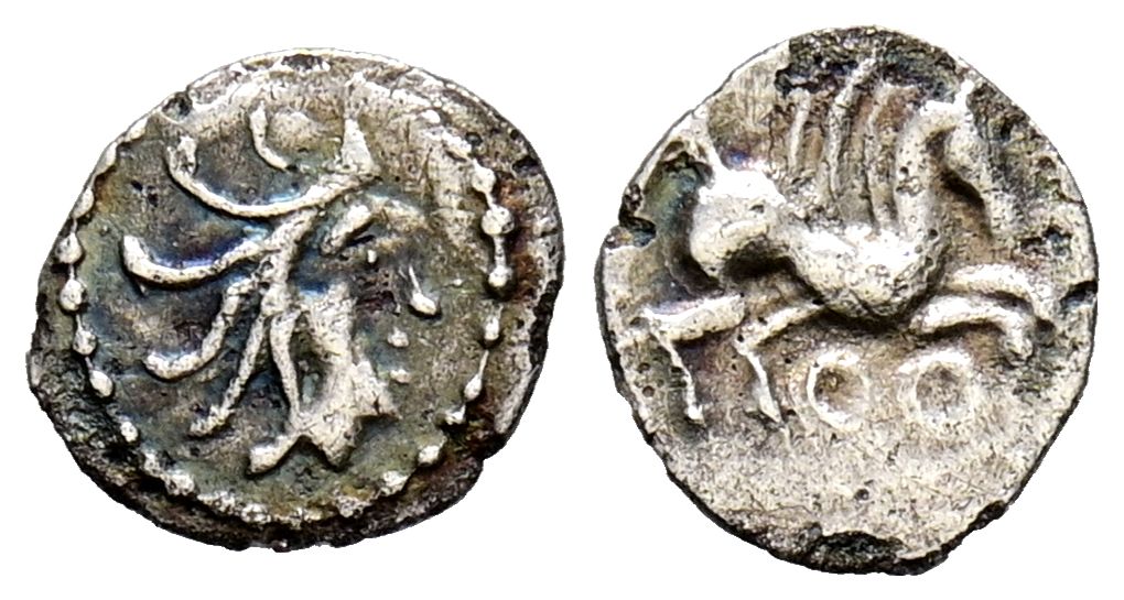 EMPORION (Ampurias, Gerona). Hemitrietartemorion (Ar. 0.14g/7mm). 450-400 Fine (FAB-1197). Obv: Female head with headdress left. Reverse: Pegasus flying right, two roundels below. VF+. Light iridescent patina on reverse.