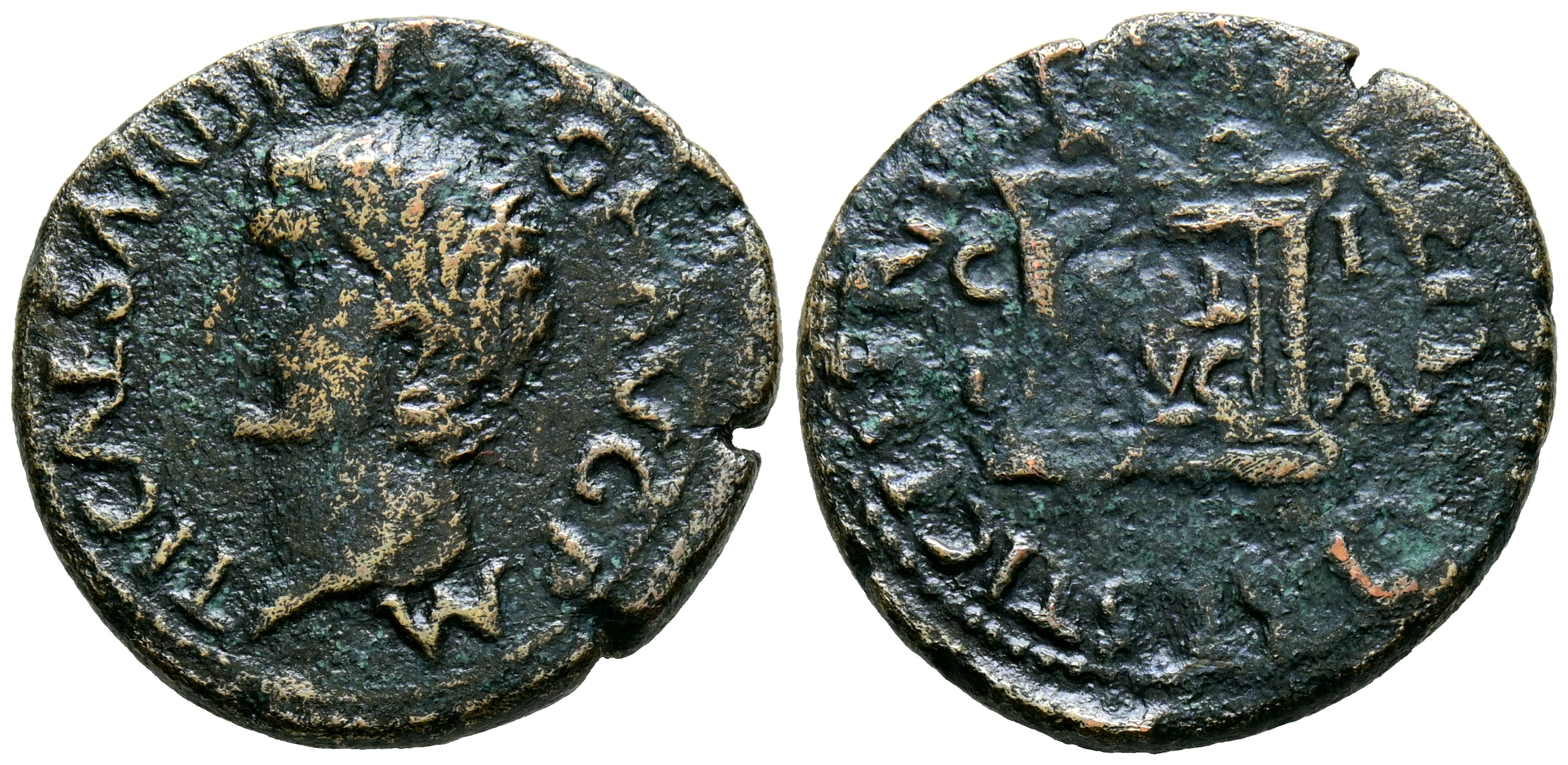 ILICI (Elche, Alicante). Semis. (Ae. 6.51g/23mm). 14-36 AD (FAB-1526). Anv: Head of Tiberius left, around legend: TI CAESAR DIVI AVG F AVG P M. Rev: Altar, inside: SAL/AVG, on the sides: CI/ IA, around legend: M IVLIVS SETTAL L SESTI CELER II VIR. Very Fine-. Cleaned.