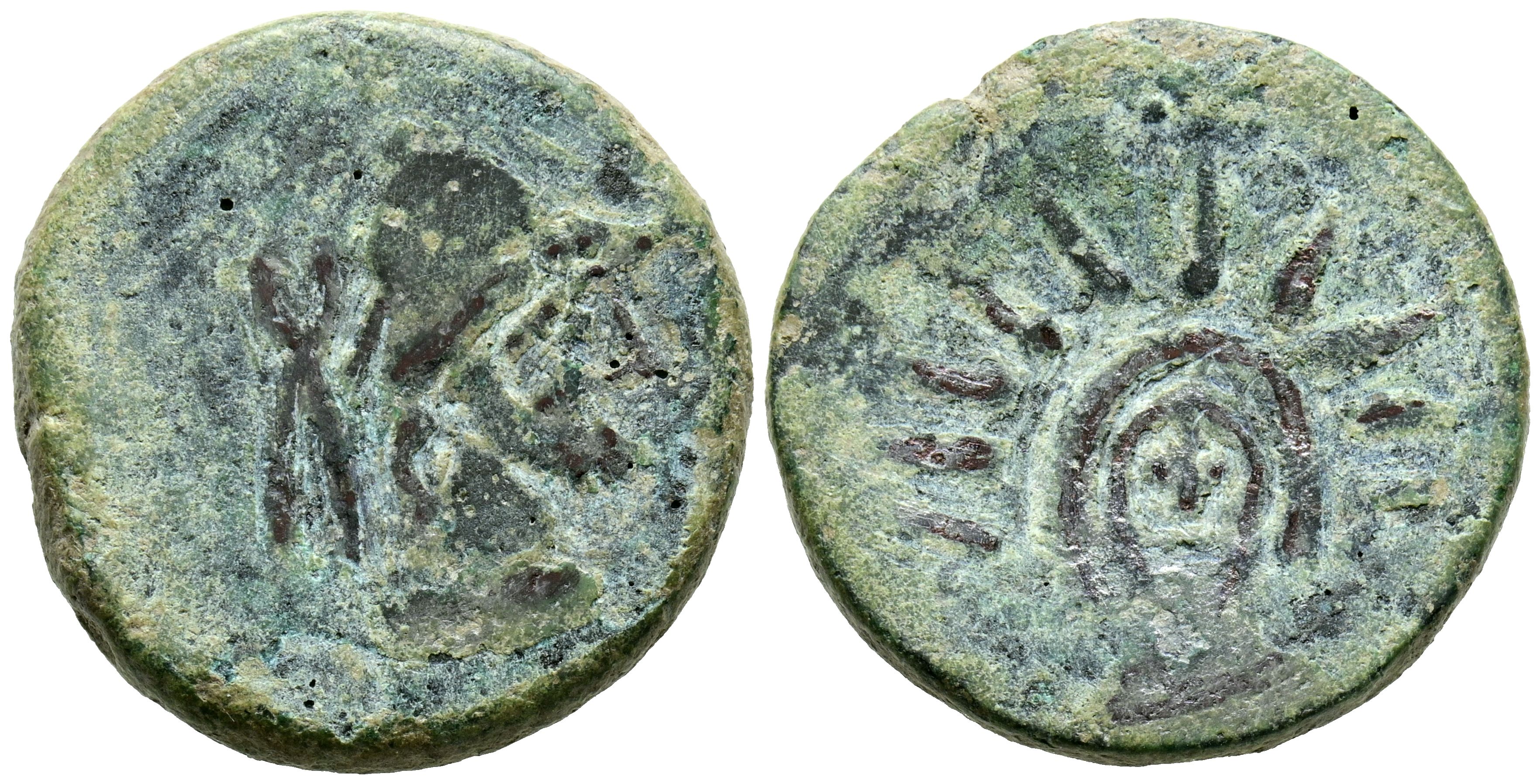 English MALACA (Málaga). As. (Ae. 10.23g/25mm). 200-20 Fine (FAB-1727). Anv: Head of Vulcan right, behind pincers and Punic legend type A. Rev: Head of Helios facing forward. Fine-. Cleaning shine.