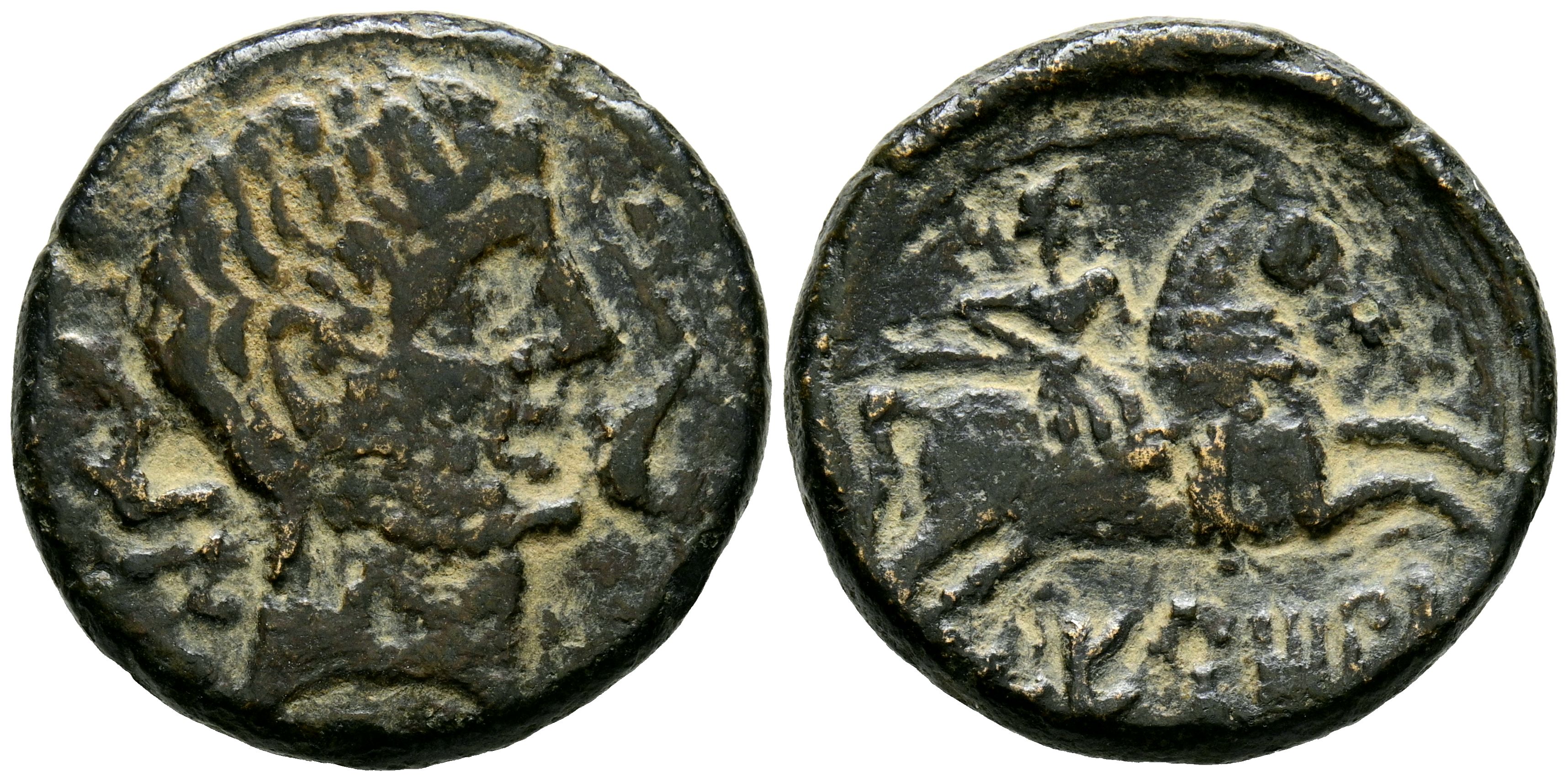 NERTOBIS (Calatorao, Zaragoza). As. (Ae. 8.86g/24mm). 120-20 Fine (FAB-1771). Obv: Male head facing right between two dolphins, behind Iberian letter N. Rev: Horseman with lance facing right, below Iberian legend: NERToBiS. VF-. Scarce specimen.