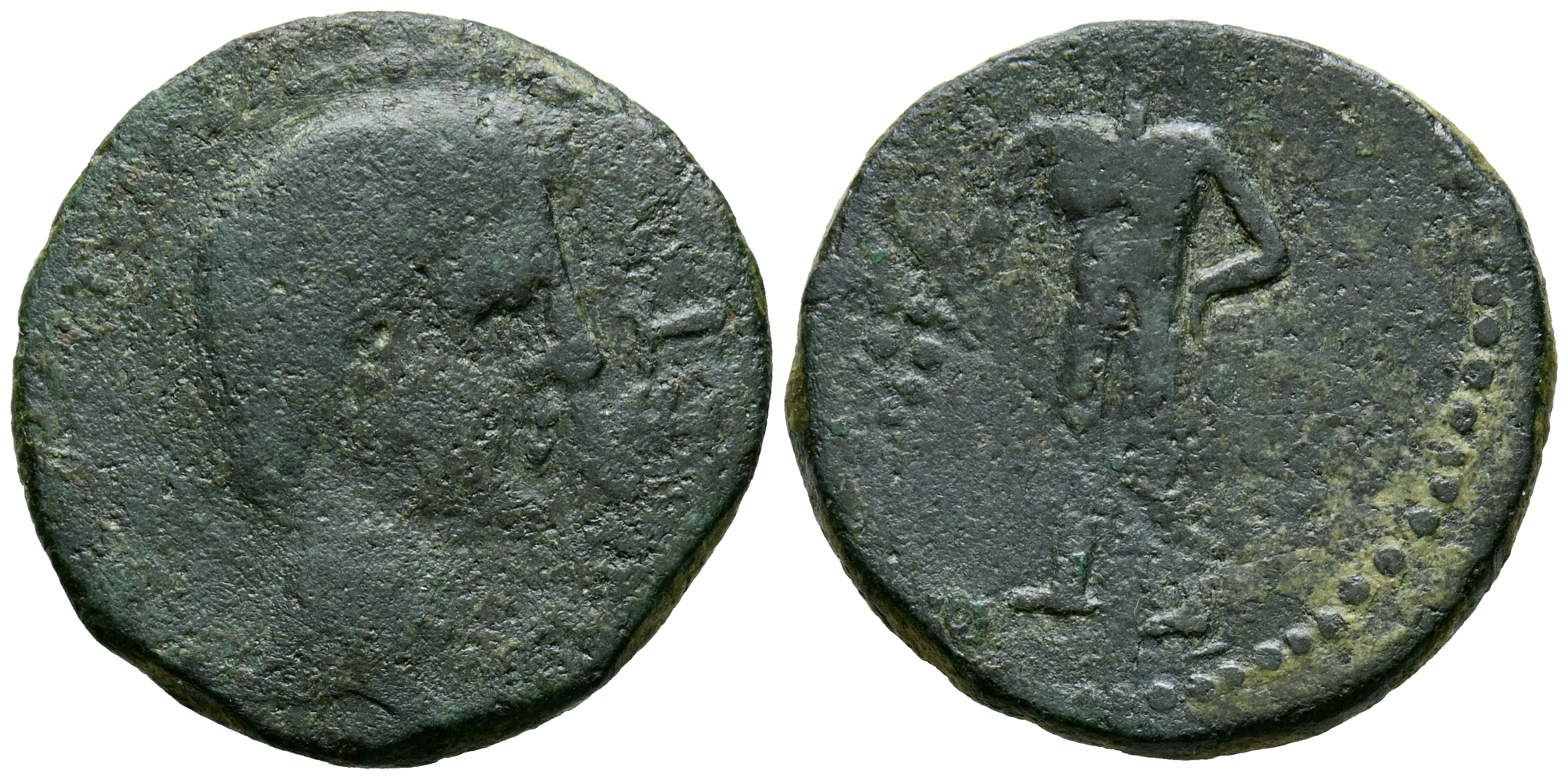 English OSET (San Juan de Aznalfarache, Seville). As. (Ae. 6.11g/24mm). 120-20 Fine (FAB-1949). Obv: Male head right, inscription in front: OSSET. Rev: Genius standing left with bunch of grapes. VF-.