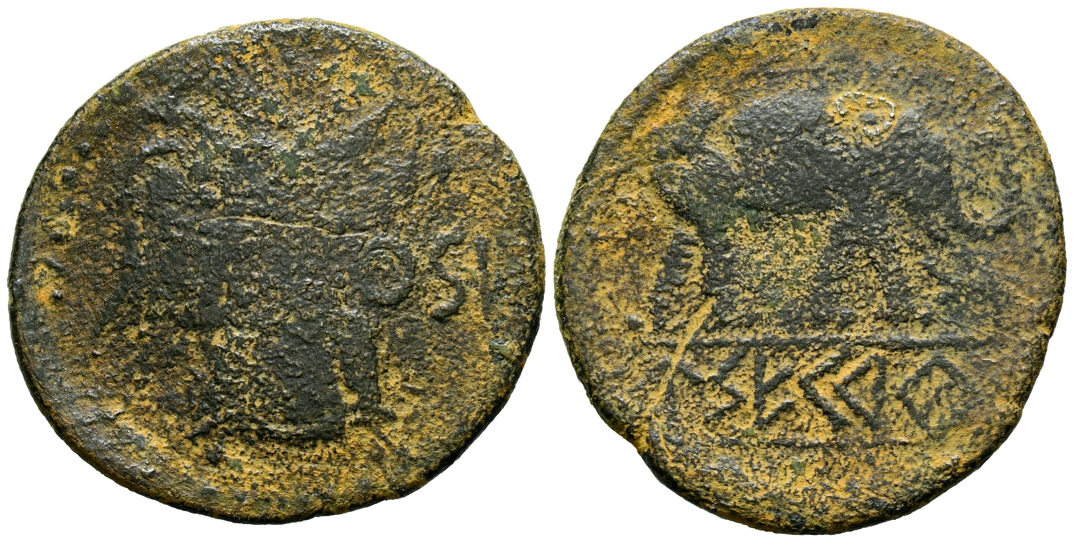 OSICERDA. Semis. (Ae. 4.89g/25mm). 50-20 Fine (FAB-1956; ACIP 1292). Obv: Victory advancing right with crown and palm, OSI in front. Rev: Elephant advancing right treading Gallic carnyx, below between lines: USEKeRTe. Good/Fine-. Rare.