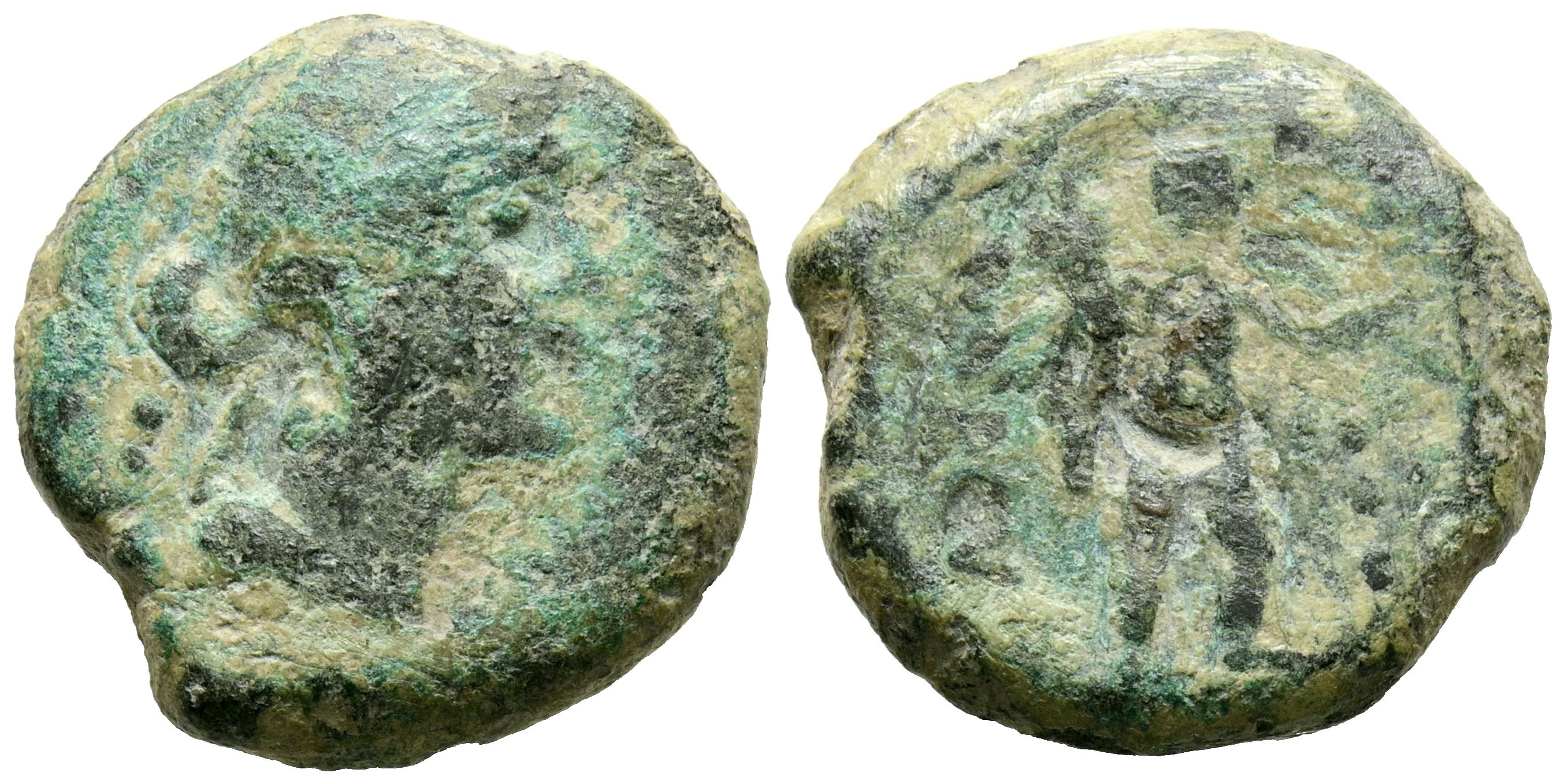COLONIA PATRICIA (Córdoba). Semis. (Ae. 6.95g/19mm). 50 Fine (FAB-1981). Obverse: Head of Venus right, behind two dots, front legend: CN IVLI LF Q. Reverse: Cupid right with cornucopia and torch, front three dots, back legend: CORDVBA. Good Fine.