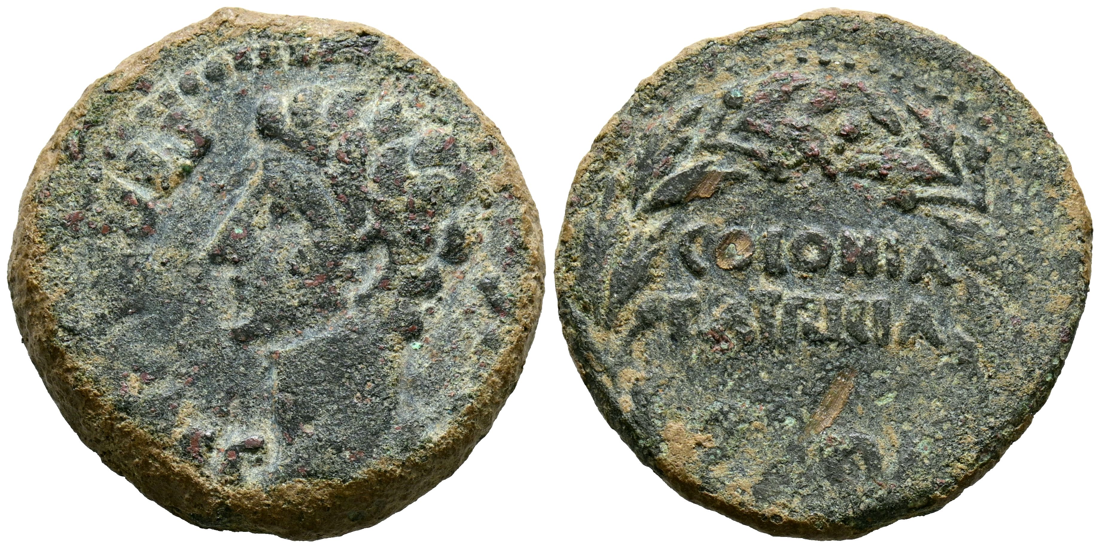 English COLONIA PATRICIA (Córdoba). As. (Ae. 10.58g/26mm). 27 Fine-14 AD (FAB-1989). Obverse: Head of Augustus facing left, around legend: PERM CAES AVG. Rev: Legend: COLONIA PATRICIA, inside laurel wreath. VF.