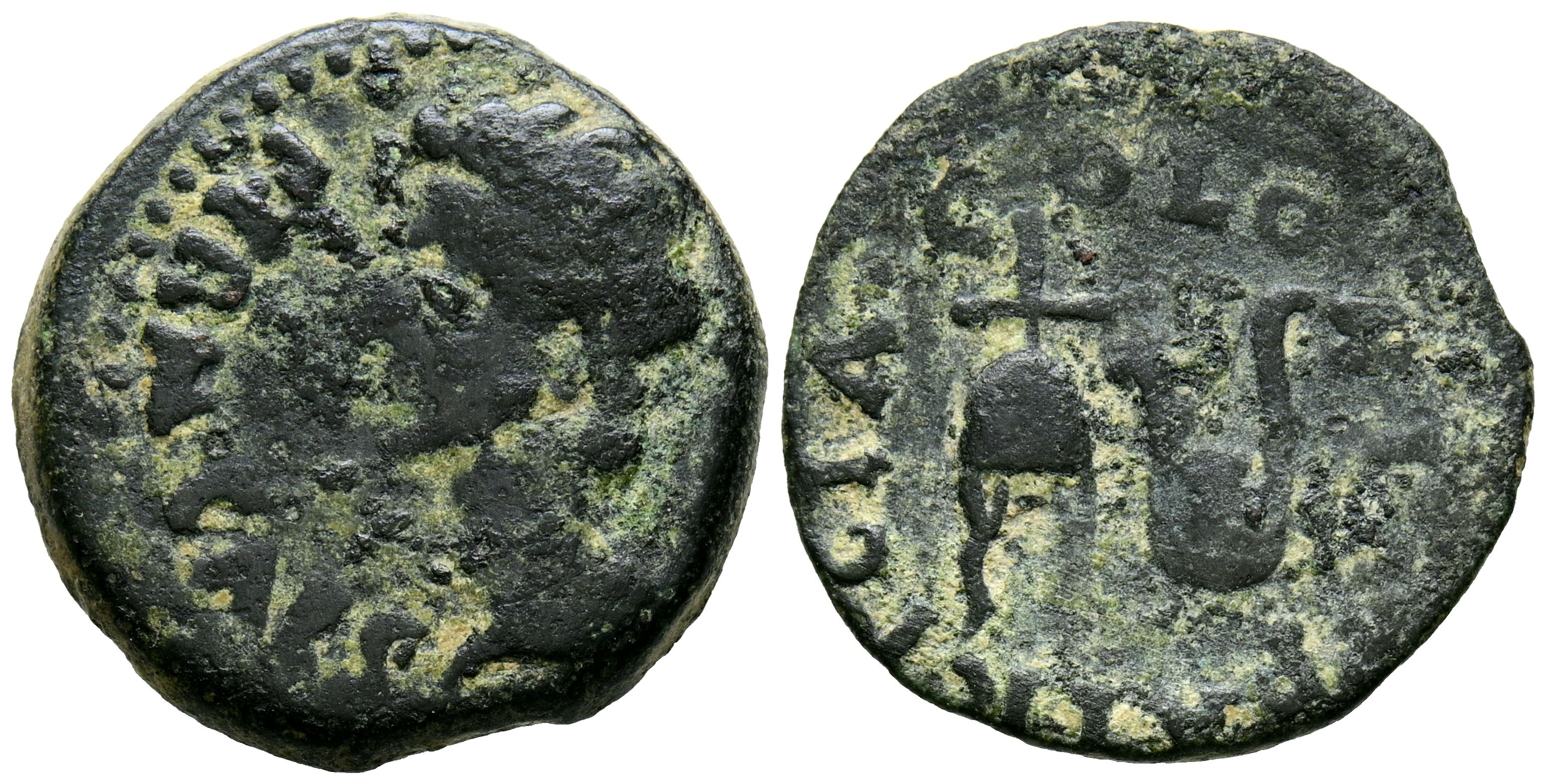 COLONIA PATRICIA (Córdoba). Semis. (Ae. 5.43g/22mm). 27 Fine-14 AD (FAB-1992). Anv: Head of Augustus to the left, around legend: PERM CAES AVG. Rev: Flamboyant cap and simpulum, around the legend: COLONIA PATRICIA. Very Fine-.