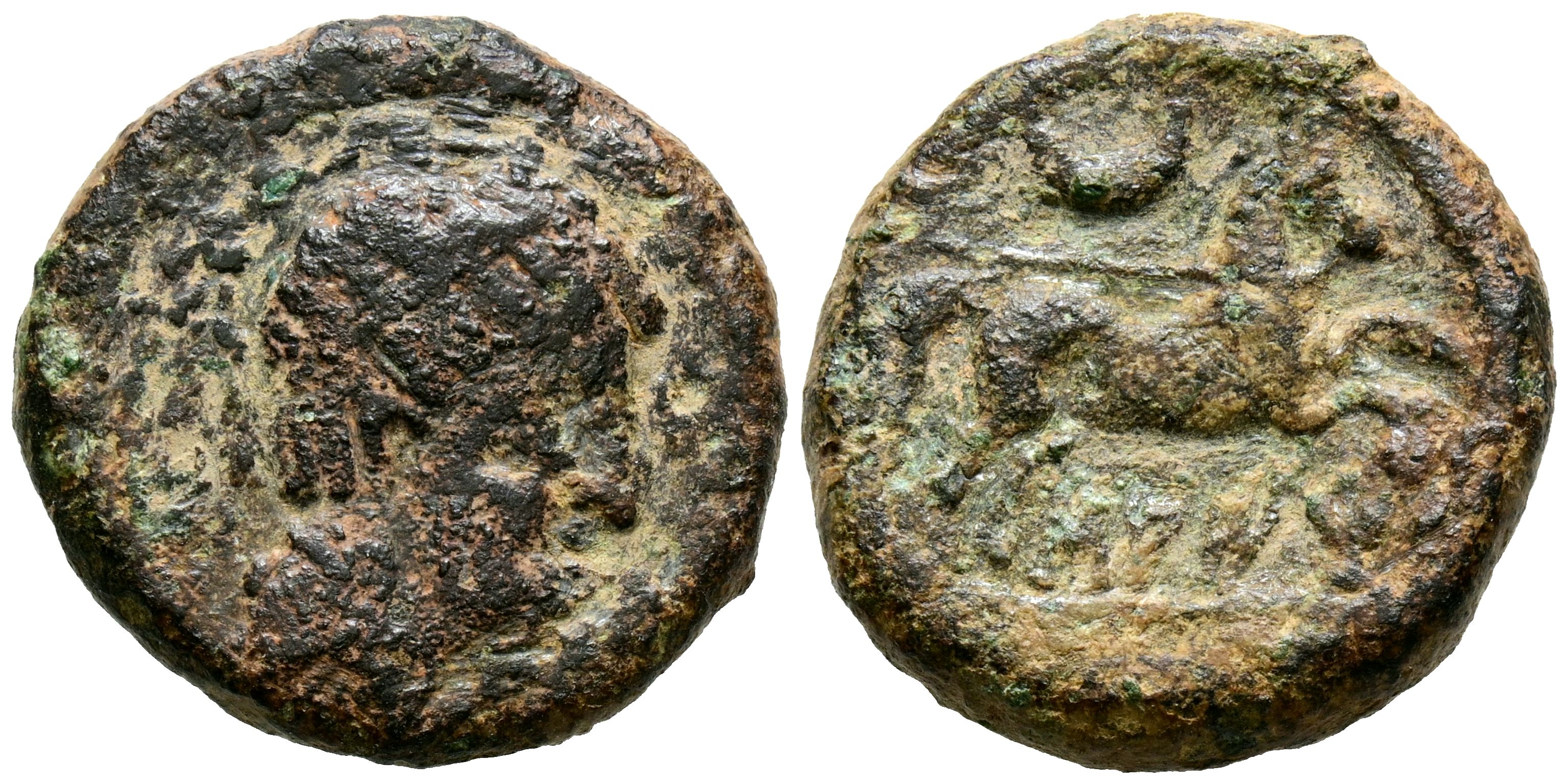 SAITI (Xátiva, Valencia). Semis. (8.16g/21mm). 120-20 Fine (FAB-2102). Obv: Diademed male head right, behind Iberian letters: Ce/Ce. Rev: Horse right, above crescent, below Iberian legend: SAITi. Good Fine. Rare specimen.