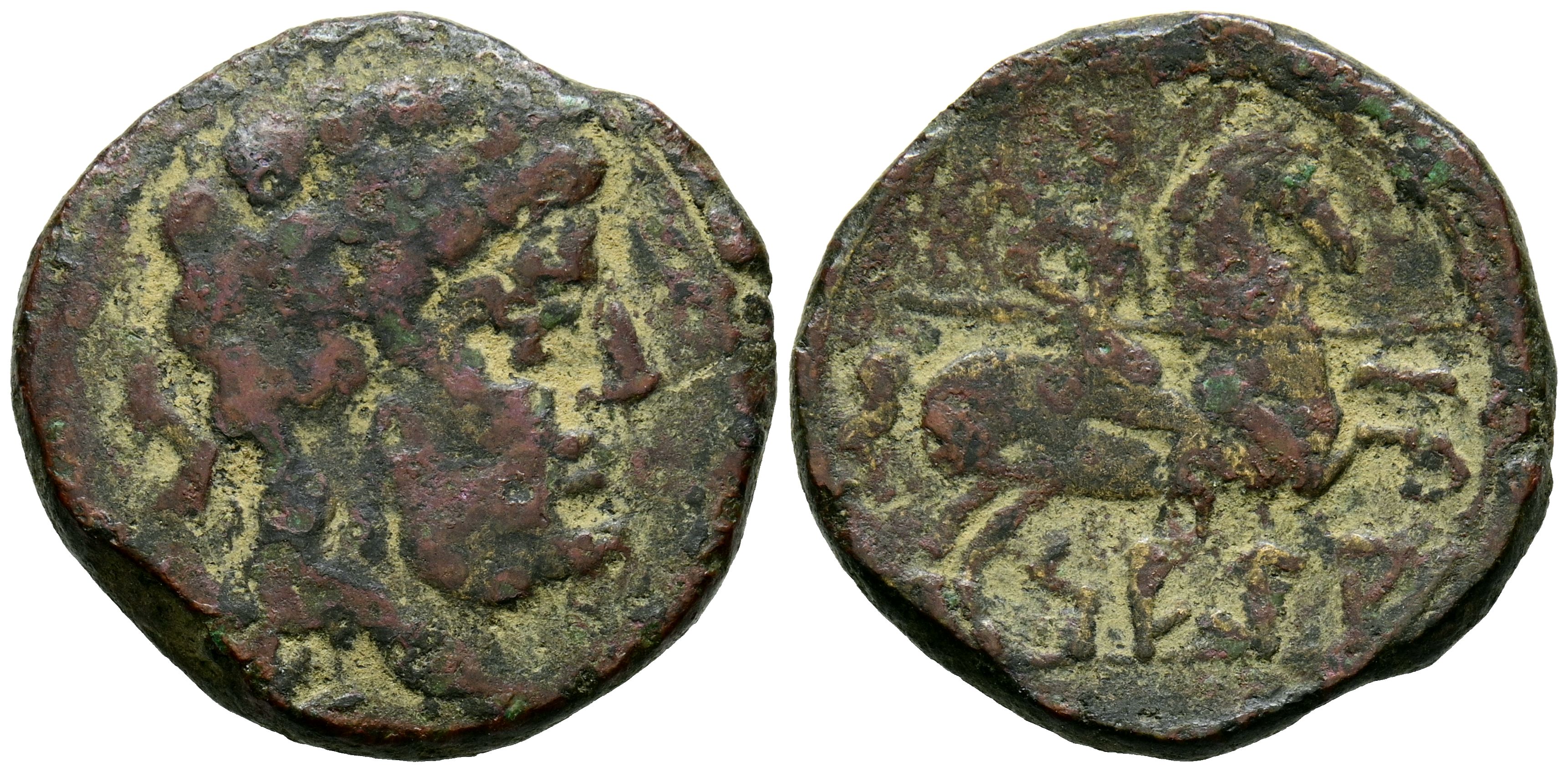 SEGIA, (Ejea de los Caballeros, Zaragoza). As. (Ae. 8.56g/24mm). 120-20 Fine (FAB-2157). Anv: Bearded male head with collar facing right, behind two dolphins. Reverse: Spearman on horseback facing right, above crescent and star, below on SEKIA line. Fine. Cleaned.