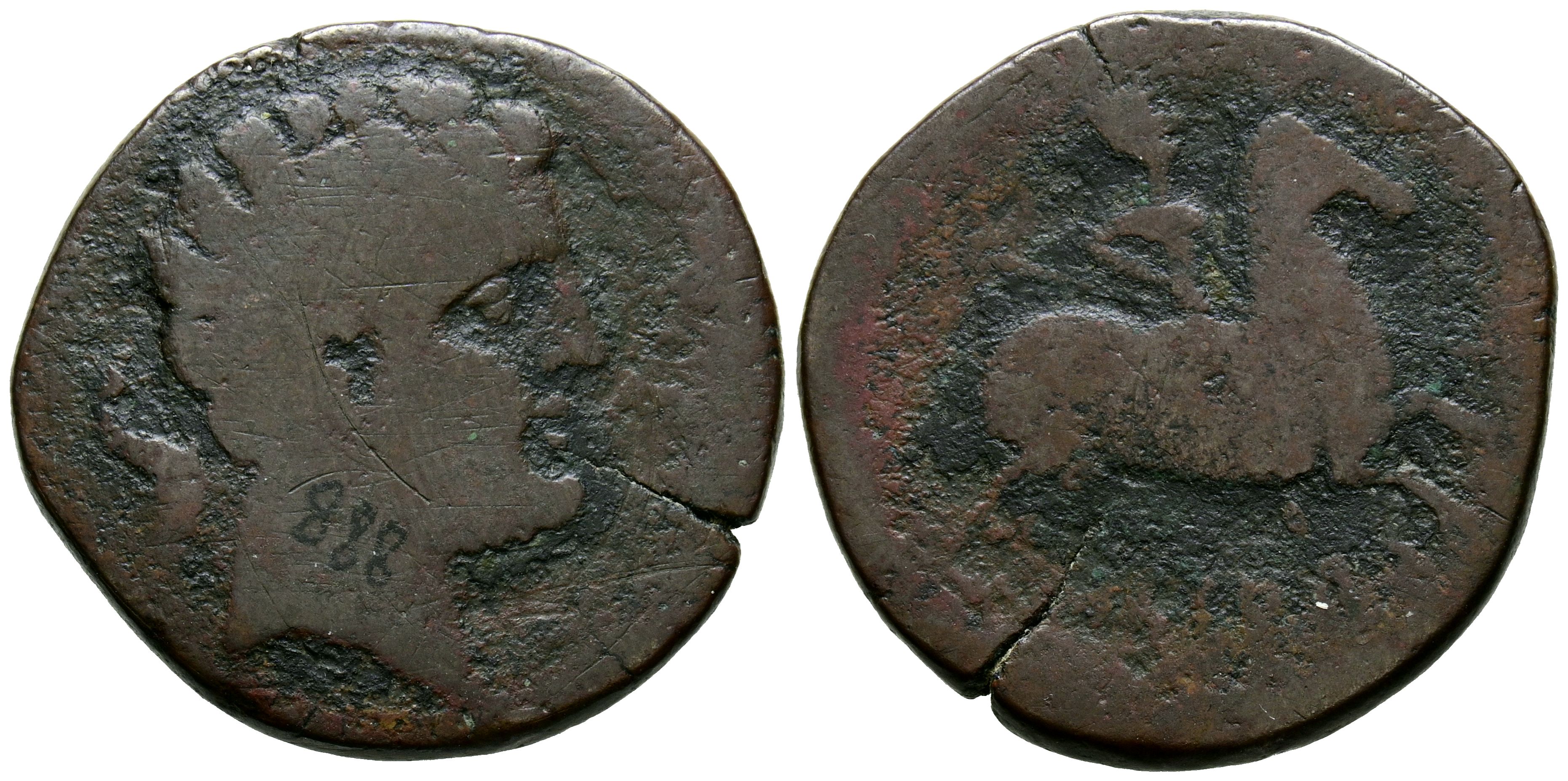 SESARS (Aragon area). As. (Ae. 9.57g/25mm). 120-20 Fine (FAB-2199). Obverse: Bearded male head to right, dolphin behind. Reverse: Horseman with lance to right, star above, Iberian legend below: SESARS. Fine-. Old collection ink number on obverse.
