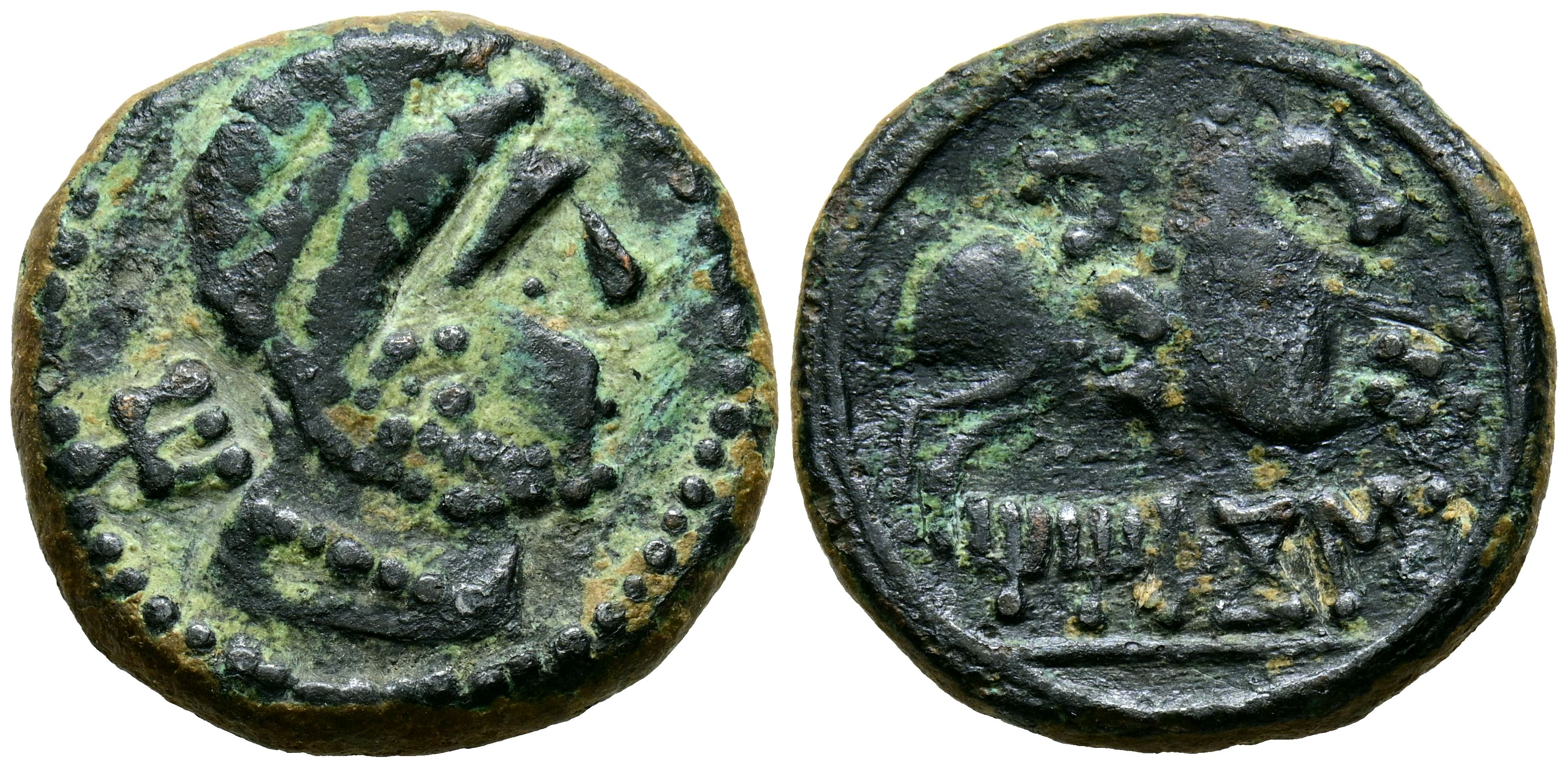 TITIACOS (Tricio, La Rioja). As. (Ae. 9.52g/24mm). 120-20 Fine (FAB-2392). Anv: Bearded male head to right, behind letter: Ti. Rev: Horseman with lance to right, below Iberian legend: TiTiACoS. Very Fine-.