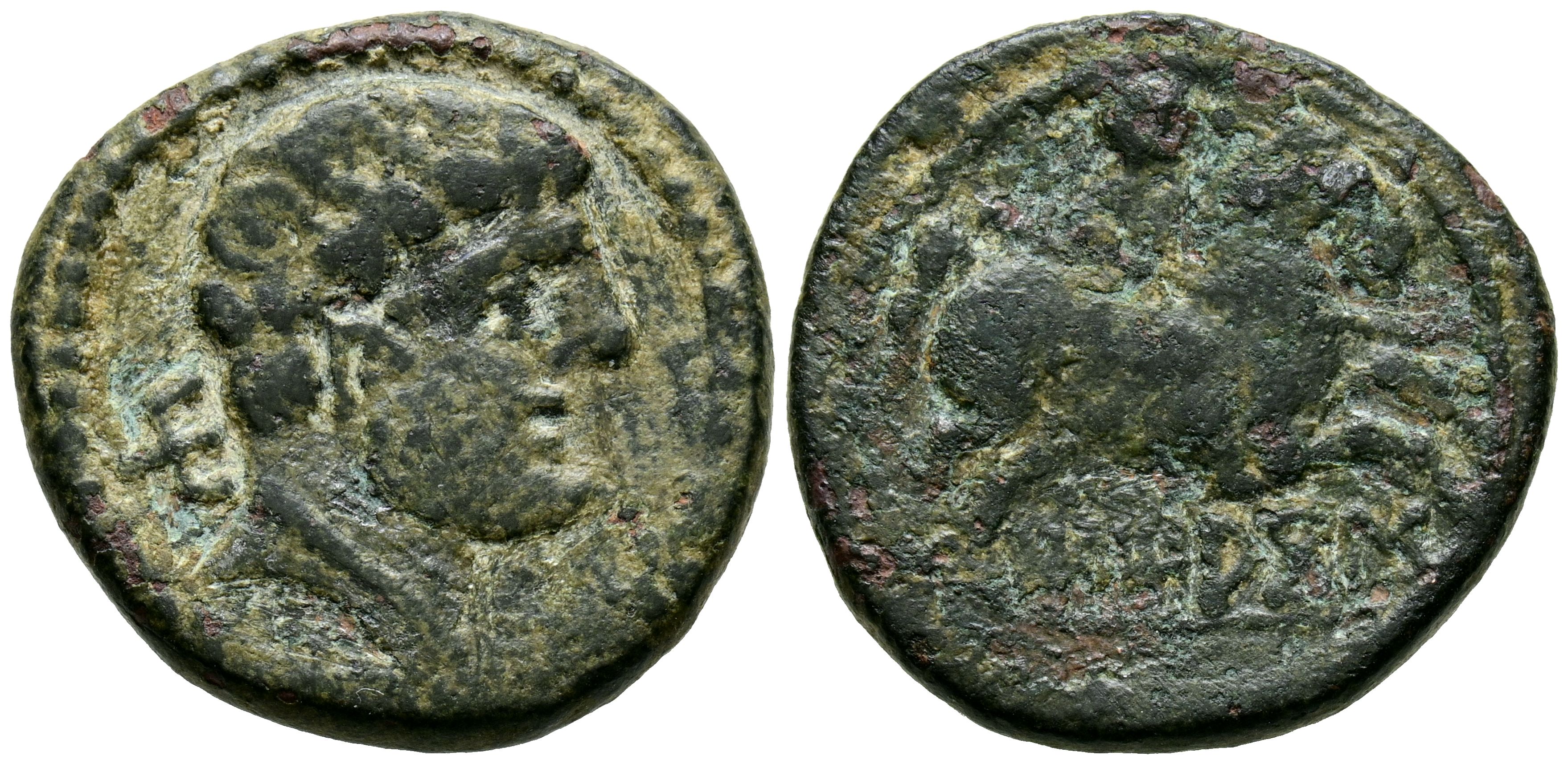 TITIACOS (Tricio, La Rioja). As. (Ae. 9.08g/24mm). 120-20 Fine (FAB-2392). Anv: Bearded male head to right, behind letter: Ti. Rev: Horseman with lance to right, below Iberian legend: TiTiACoS. Very Fine-/Fine.