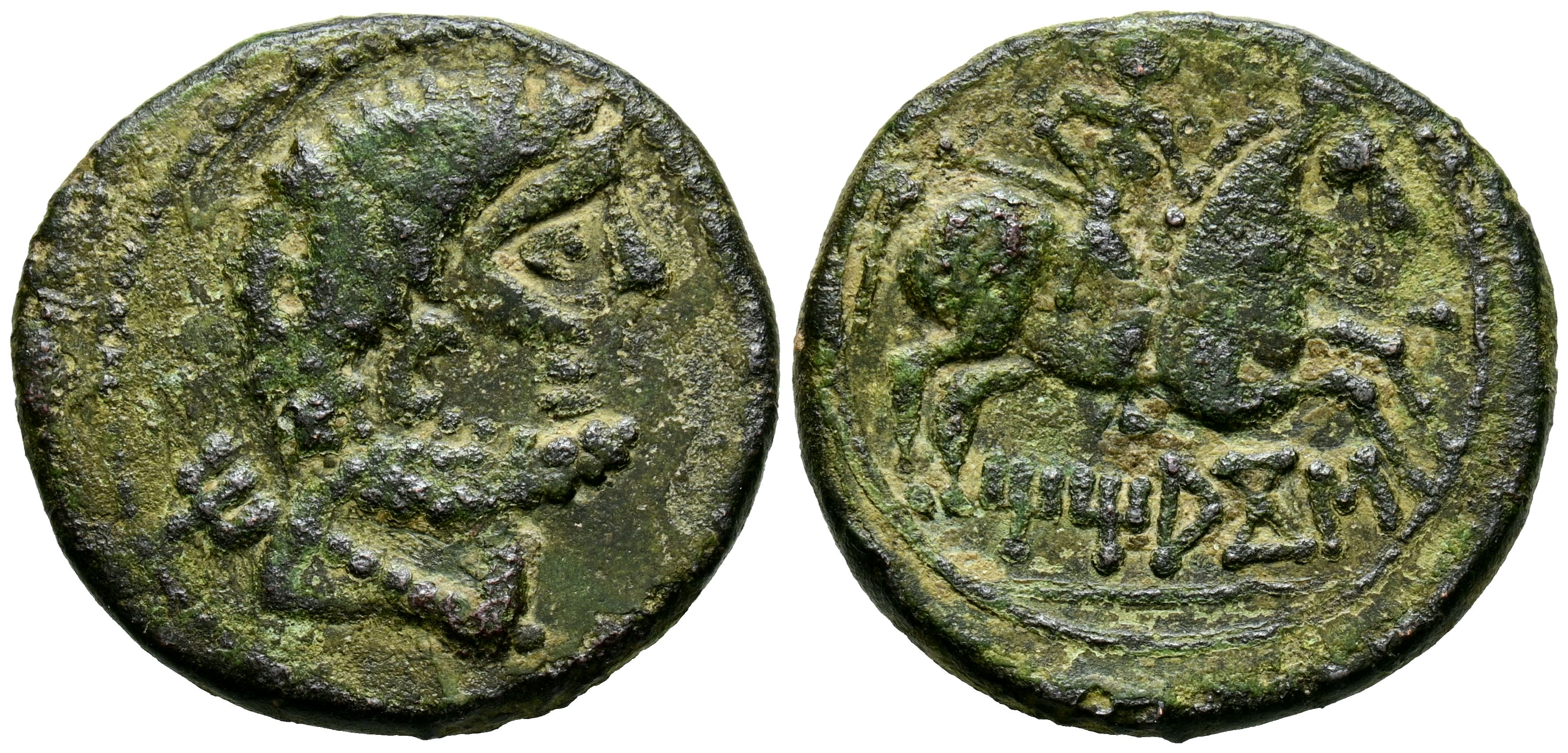 TITIACOS (Tricio, La Rioja). As. (Ae. 7.80g/25mm). 120-20 Fine (FAB-2395). Anv: Bearded male head to right, behind Iberian letter: Ti. Rev: Horseman with lance to right, below curved Iberian legend on a line: TiTiACoS. VF-.