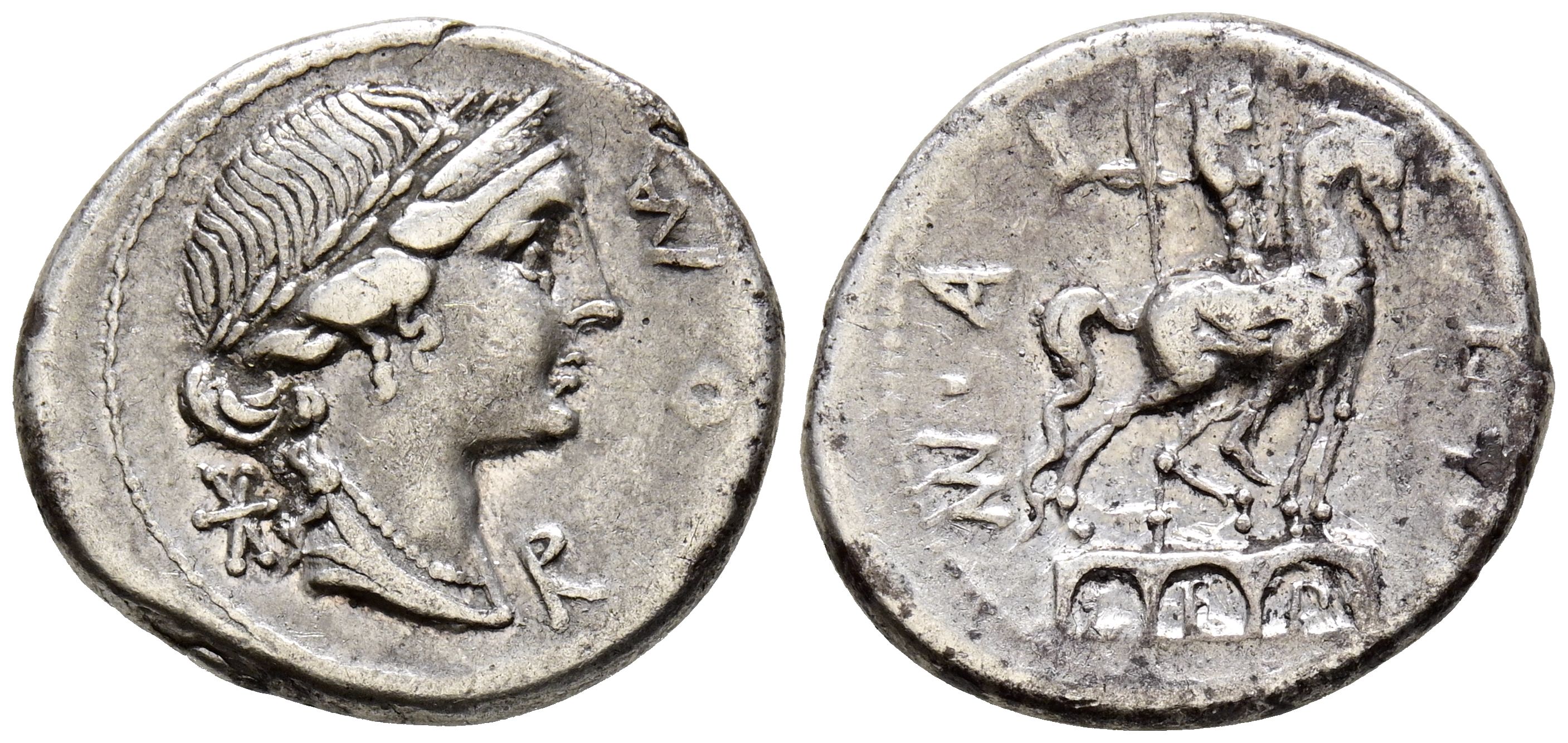GENS AEMILIA. Denarius. (Ar. 3.96g/20mm). 114-113 Fine. South Italian mint. (FFC 103; Crawford 291/1). Obv: Laureate head of Roma right, star behind, legend in front: ROMA. Reverse: Equestrian statue on three arches right, between the arches: LEP, legend around: MN AEMILIO. VF+/VF.