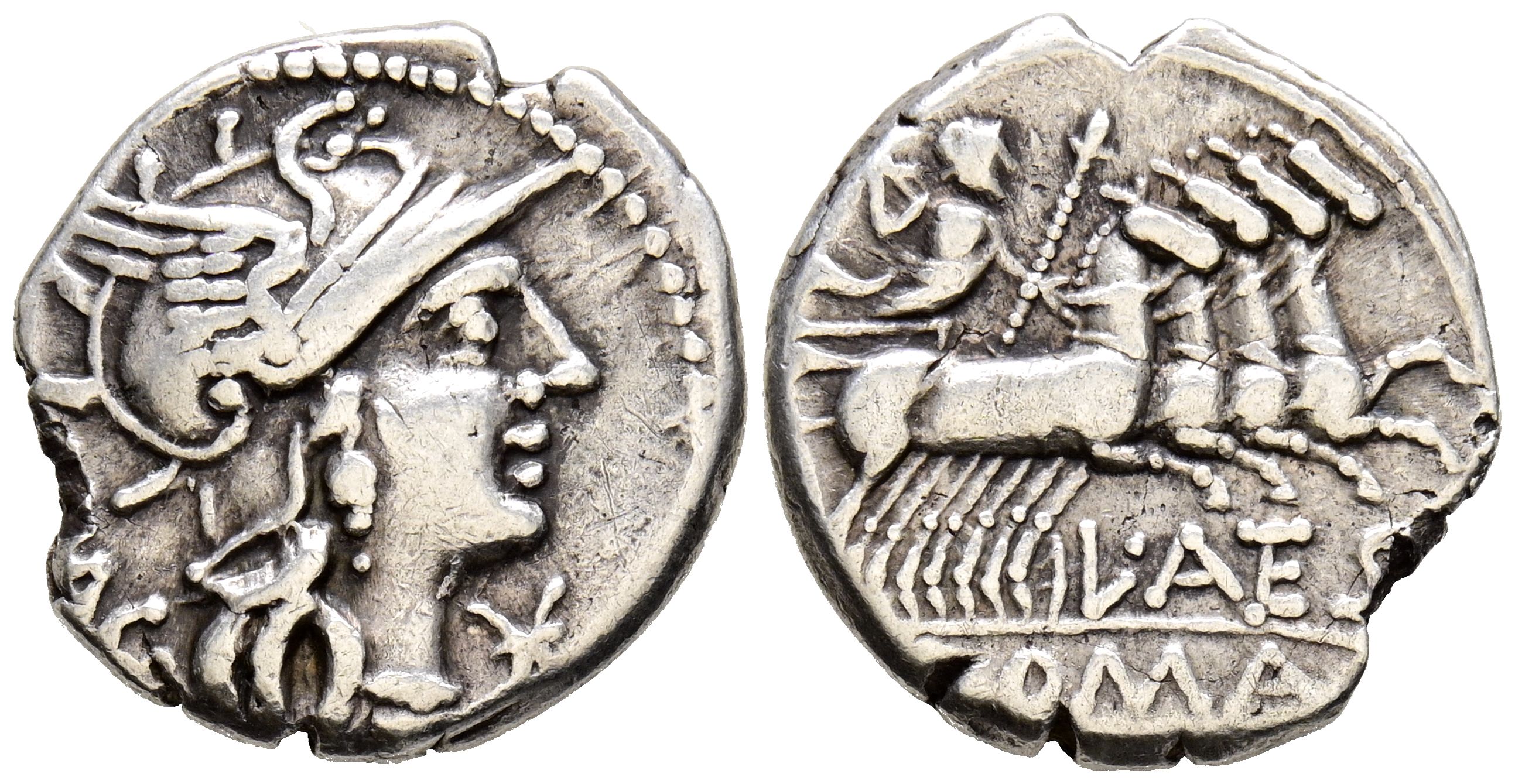 GENS ANTESTIA. Denarius. (Ar. 4.01g/19mm). 136 Fine Rome. (FFC 151; Crawford 238/1). Obv: Head of Roma right, behind legend: GRAG, in front star. Rev: Jupiter in quadriga right with sceptre and bundle of rays, below legend: L ANTES, in exergue: ROMA. VF-.