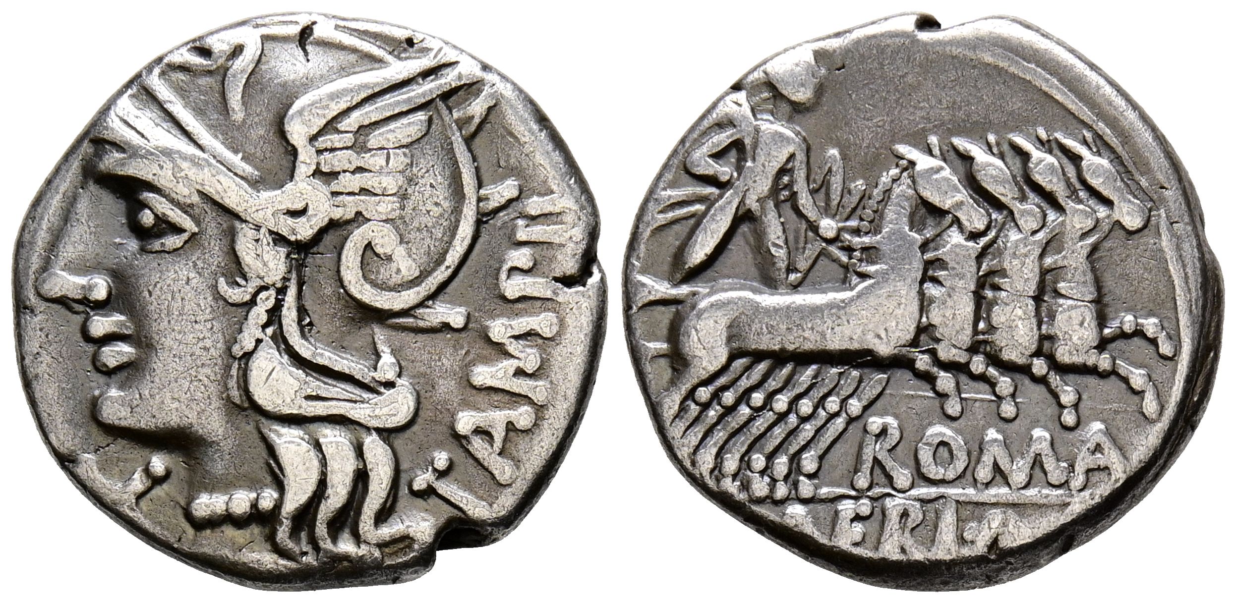GENS BAEBIA. Denarius. (Ar. 3.76g/17mm). 137 Fine Rome. (FFC 199; Crawford 236/1a). Obv: Head of Roma left with collar, in front X, behind legend: TAMPIL. Rev: Apollo with palm, bow and arrows leading quadriga right, below legend: ROMA, in exergue: M BAEBI QF. Very Fine-.